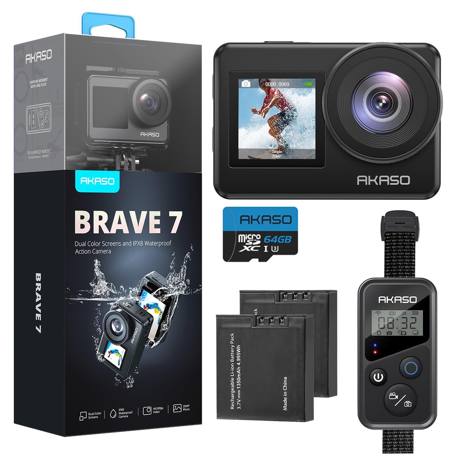 AKASO Brave 7 Action Camera 4K30FPS 20MP with 64GB U3 MicroSDXC Memory Card, Waterproof Camera with Touch Screen IPX8 33FT EIS 2.0 Zoom Support External Mic Voice Control with 2X 1350mAh Batteries