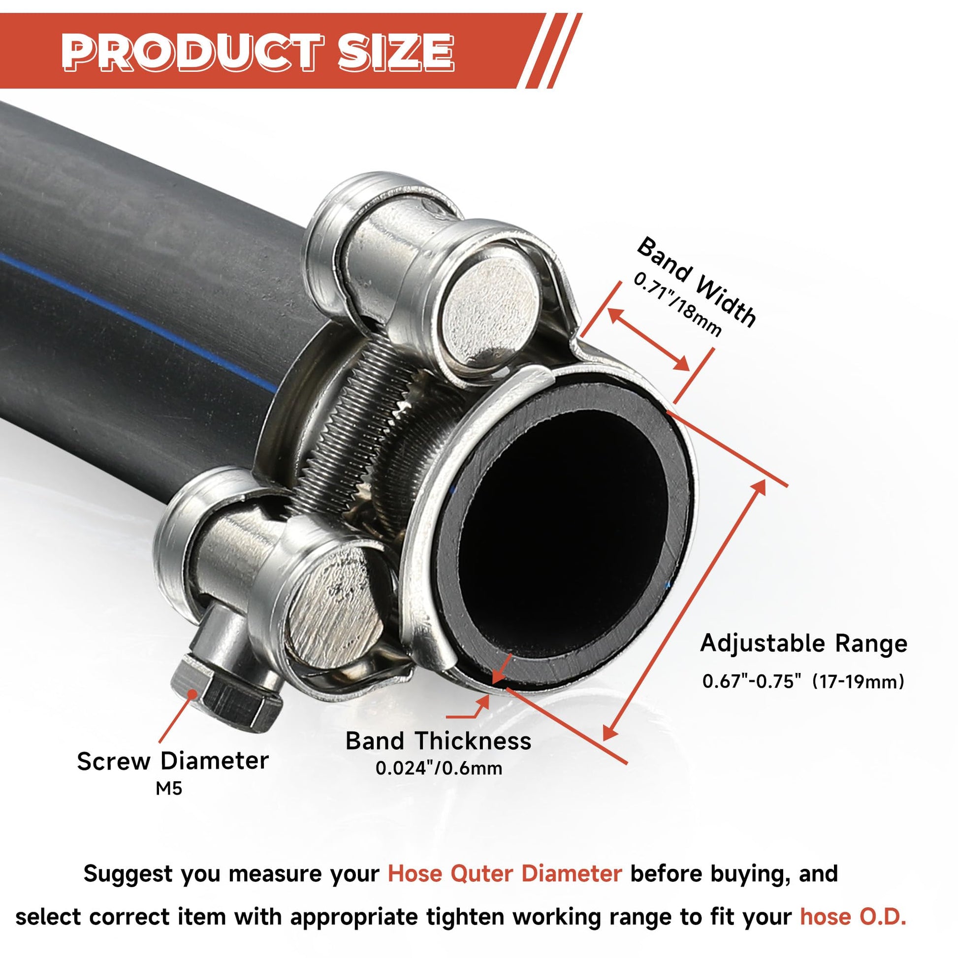 • 🪐【Clamps Size】---T bolt clamp adjustable Work Range: 17-19mm (0.67'-0.75' ); Width: 18mm (0.7'); Thickness: 0.6mm (0.024'); The screw bolt size: M6*40mm. To save you time, please check carefully and measure your hose OD to fit T bolt clamp working range before purchasing our products.