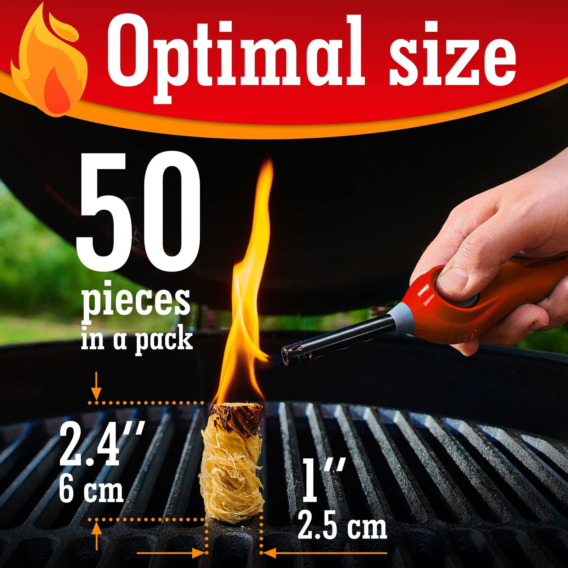 • Attention! Build a fire the right way! Step 1: Put 1-2 fire starters on the bottom and cover them with dry kindling or small twigs. Step 2: Fire up the fire starter and wait till kindling or twigs ignite. Step 3: Maintain the fire by adding larger dry firewood pieces or charcoal. Make sure there is some space between the pieces of firewood to support the fire development. 50 rolls: grill starters come in the pack of 50 pieces, which is sufficient to start around 45 fires.