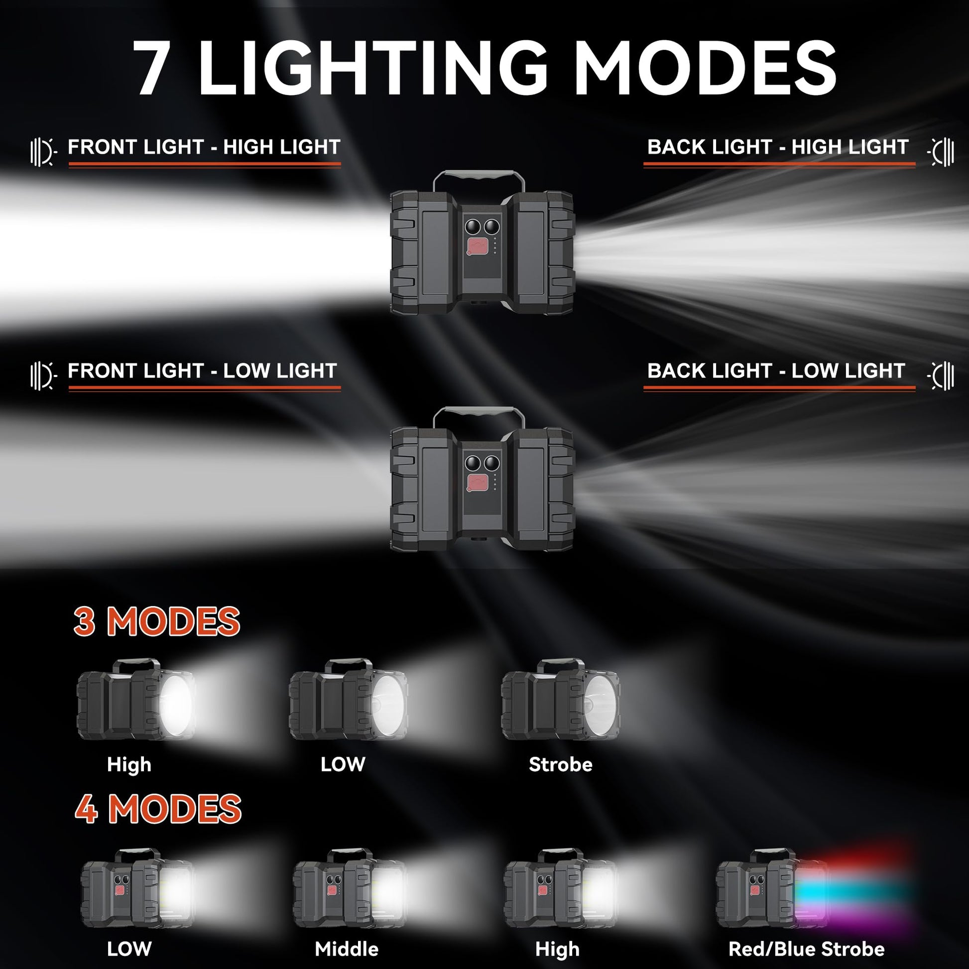 • SUPER BRIGHT FLASHLIGHT: LED Flashlights high lumens rechargeable with L2 + 45 chip LED, large wide-angle irradiation range; The brightness is up to 1200 lm, illuminating half a football field, the irradiation distance can reach 800 m; Rechargeable spotlight flashlight suitable for camping, road exploration, night work