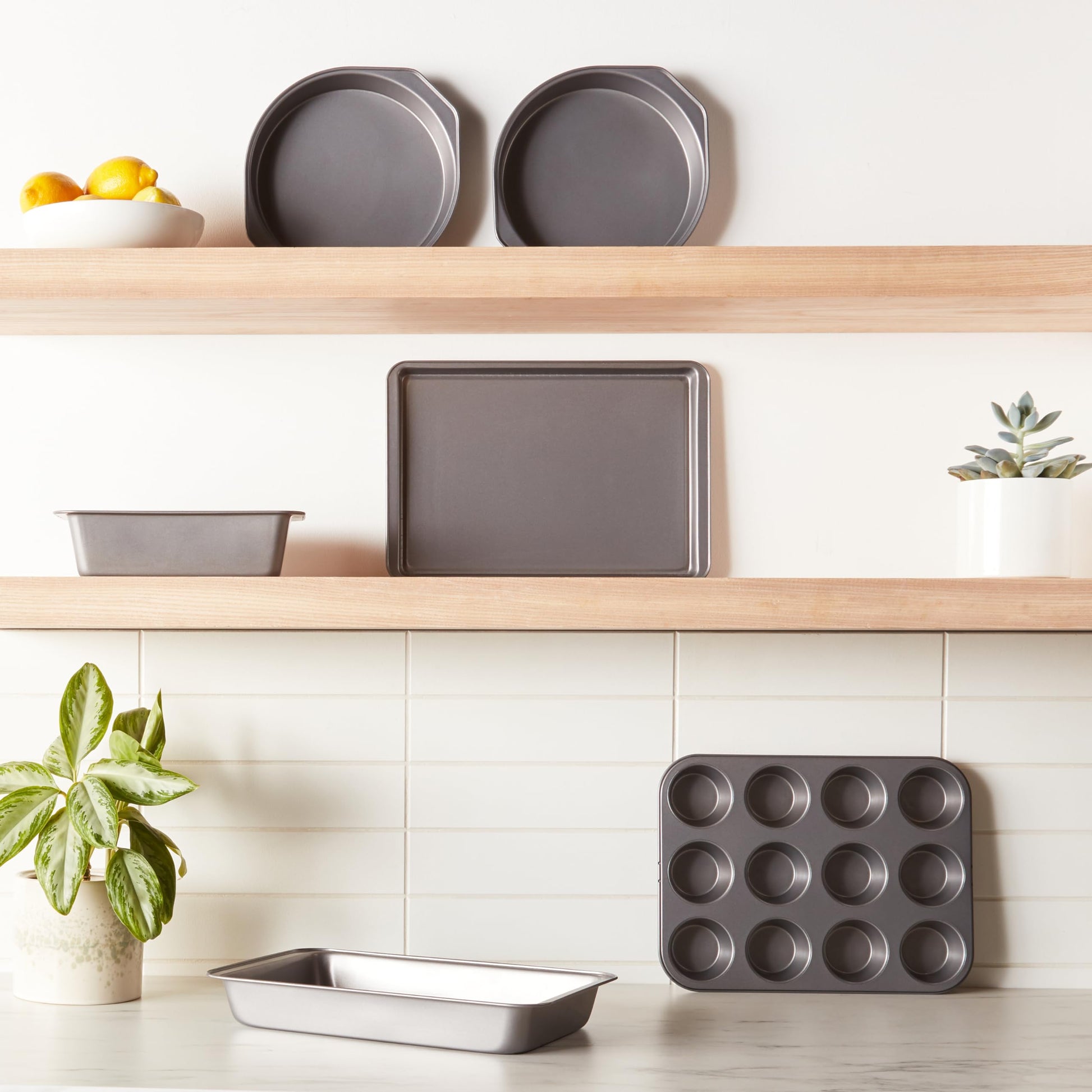 • 6-piece bakeware set includes a 9 x 5-inch loaf pan, 2 round 9-inch cake pans, a 12-cup muffin pan, a 13 x 9-inch roast pan, and a 13 x 9-inch baking sheet