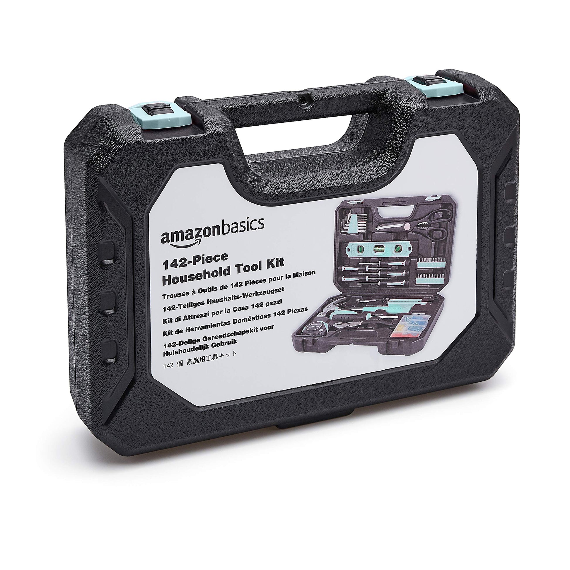 Amazon Basics 142-piece tool set is idea for everyday household projects, repairs, and DIY tasks. This set includes: (1) 8oz Hammer, (8) SAE Hex Key Wrenches, (1)10ft Tape Measure, (1) 8.5in Scissor, (20) Screwdriver Bits, (1) Magnetic Bit Holder, (1) Bit Extension, (1) 6in Slip Joint Plier, (1) Utility Knife with Blade, (5) Precision Screwdrivers, (1) 9in Torpedo Level, (100) Hardware kits, and (1) Storage case.