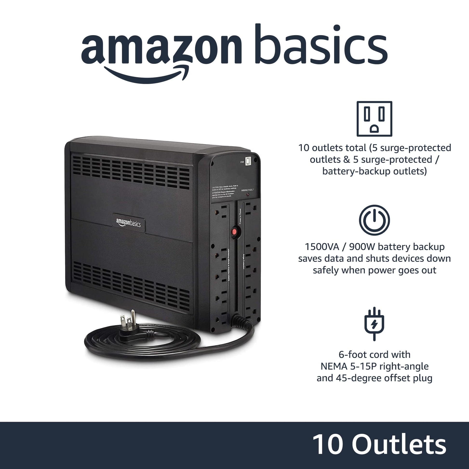 Amazon Basics UPS Battery Backup & Surge Protector 1500VA/900W, 10 Outlets, Line Interactive Uninterruptible Supply, for Power Outage Protection, Black