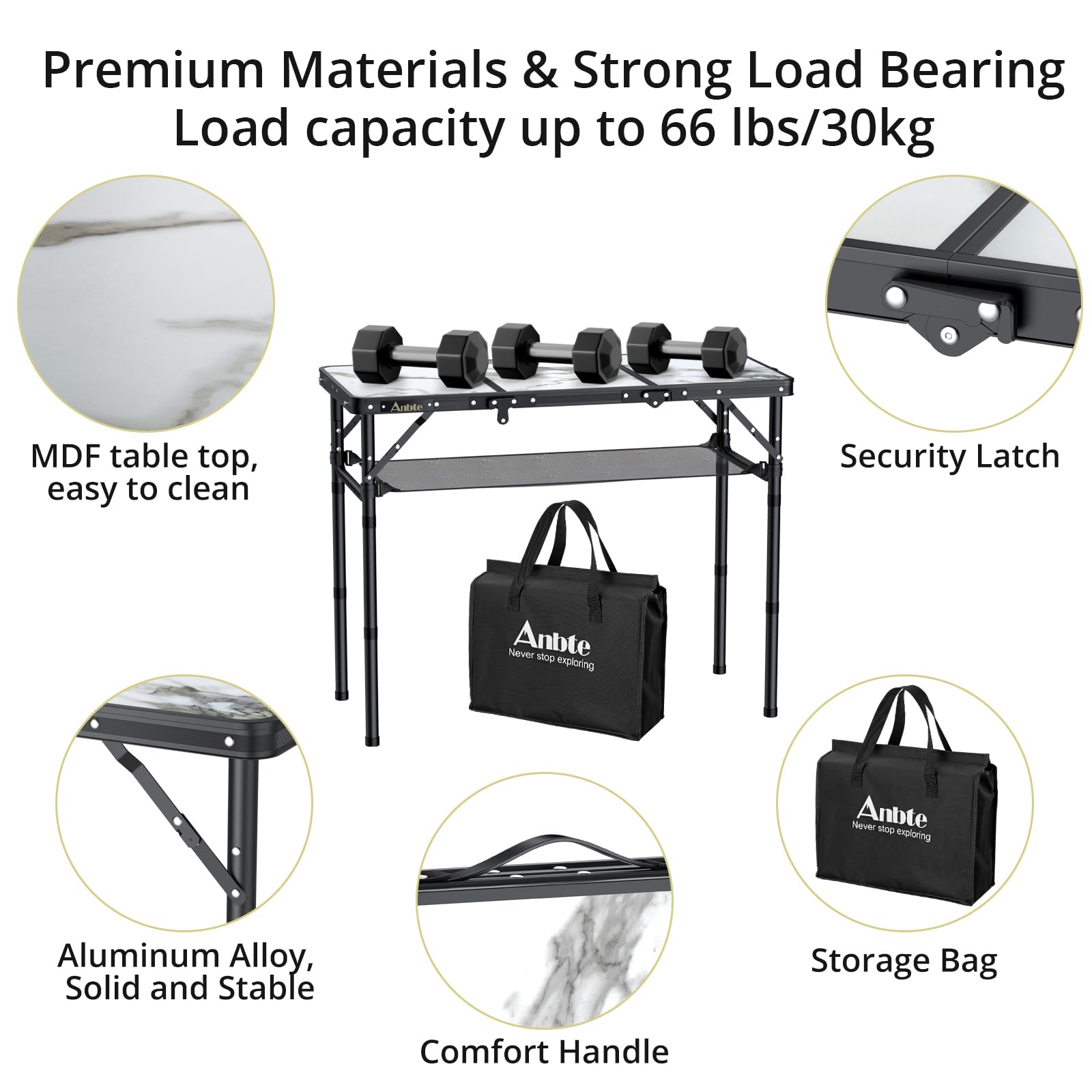 • 【Premium Quality Materials, Strong Load-Bearing】 Anbte portable folding table's frame is made of thickened aluminum alloy and can hold up to 66 pounds, making it extremely stable. It comes with a U-shaped frame and buckles for added stability and durability