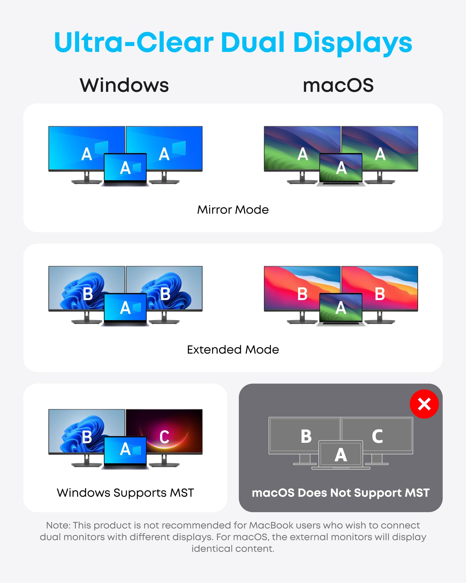 • Dual HDMI Display: Stream or mirror content to a single device in stunning 4K@60Hz, or hook up two displays to both HDMI ports in 4K@30Hz. Note: For macOS, the display on both external monitors will be identical.
