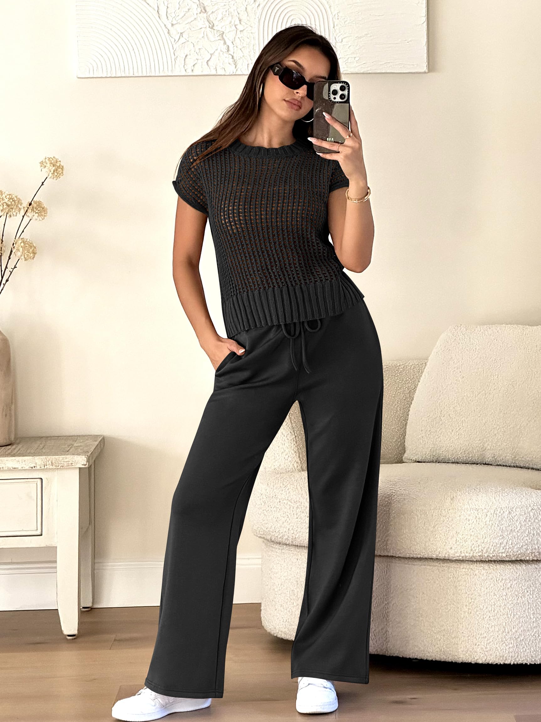 ANRABESS Women Two Piece Outfits Crochet Sheer Knit Sweater Top Wide Leg Pants Lounge Matching Sets Sweatsuit Travel Clothes Black X-Large