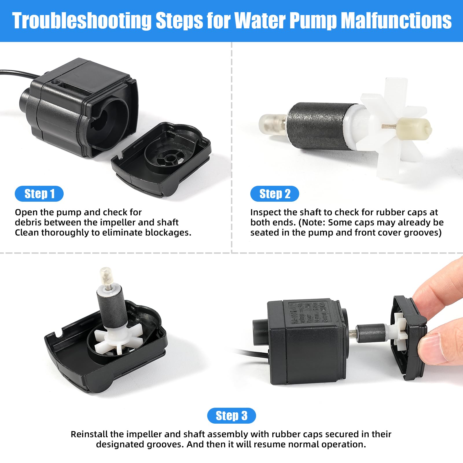 • Note: No USB power adapter included, the tank need power of DC 5V/ 2A. Make sure the adapter you use is powerful enough. Insufficient power of the adapter may cause the light or the pump not working. If the pump stops working or the water flow decreases, it is time to remove the pump, clean it thoroughly, and then properly reinstall the impeller and shaft assembly to restore normal operation. And the pump need to be FULLY SUBMERGED UNDER WATER to work.