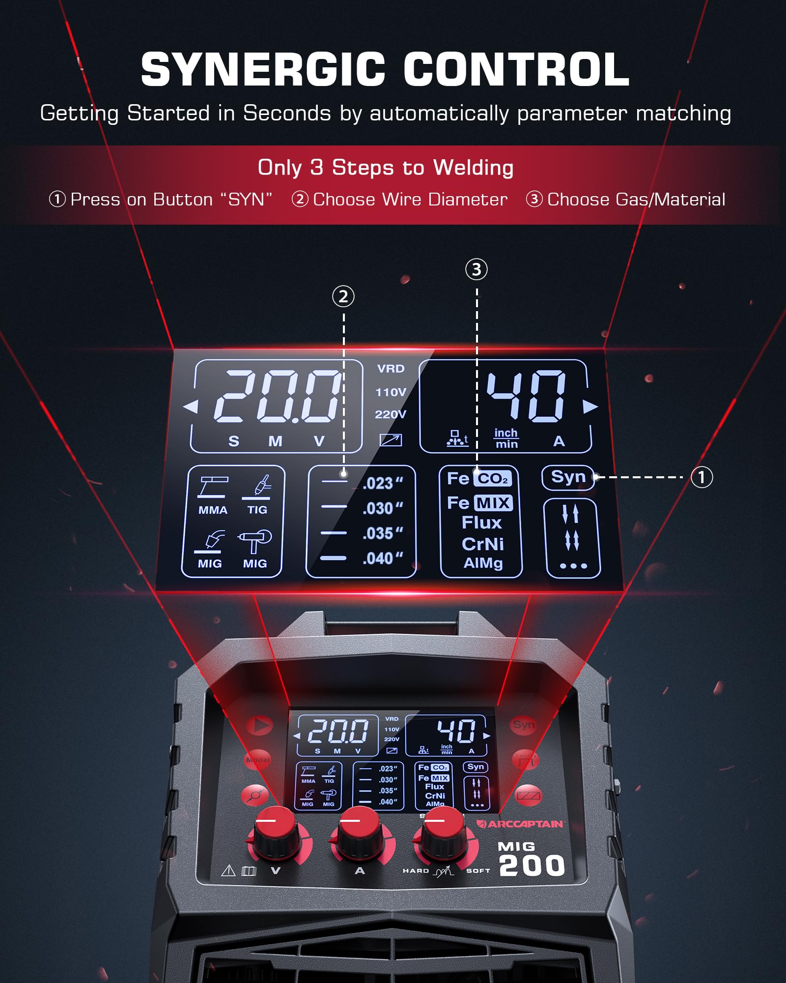 ARCCAPTAIN MIG Welder, 200Amp 6 in 1 Gas MIG/Gasless Flux Core MIG/Stick/Lift TIG/Spot welding/Spool Gun 110V/220V Aluminum Multi Process Welding Machine with LED Digital Display, Burn Back Adjustment