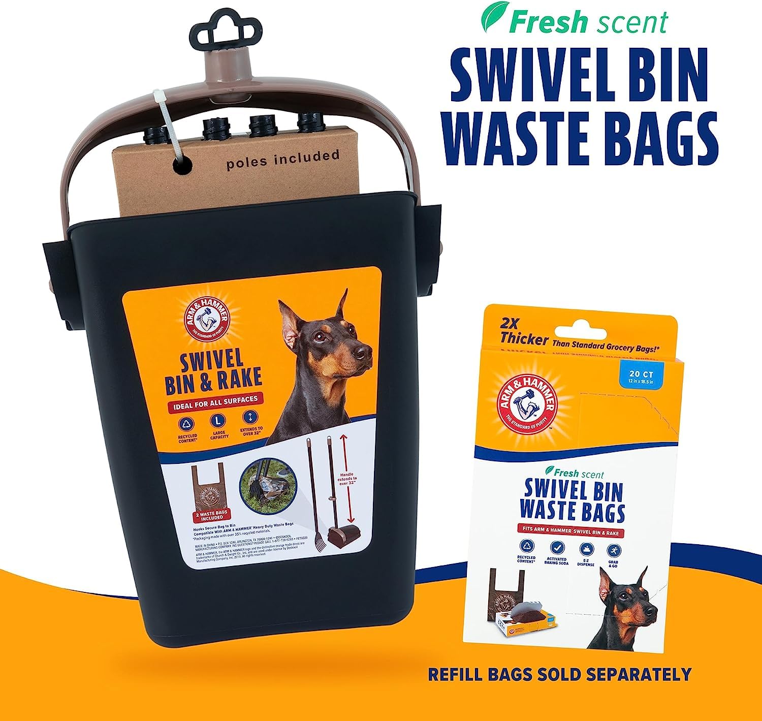 Arm & Hammer 70067 Swivel Bin & Rake, Black/Penny The Arm & Hammer Swivel Bin & Rake makes an unpleasant yet necessary task even easier. The large capacity is perfect for quick, multi-waste pick-ups. Ideal for picking up the entire yard. This bin & rake works on all surfaces including concrete, grass, etc. The handle adjusts up to 32 inches so picking up after your furry friend is no longer a back-breaking chore. Two bonus bags are included to get you started, but make sure to pick up additional Arm & Hammer Swivel Bin Waste Bags. The bags are strong & durable, provide natural odor control with activated baking soda & also have a fresh scent. The swivel bin waste bags also have easy-tie handles & help keep the bin clean Swivel bin design allows for fast & convenient pick-up Large capacity bin saves time with less unloading Includes 2 bonus plastic handle- tie bags Poles snap together & hang for compact storage Bin Hooks on both sides for use with plastic bags Extends to 32' for ergonomic operation