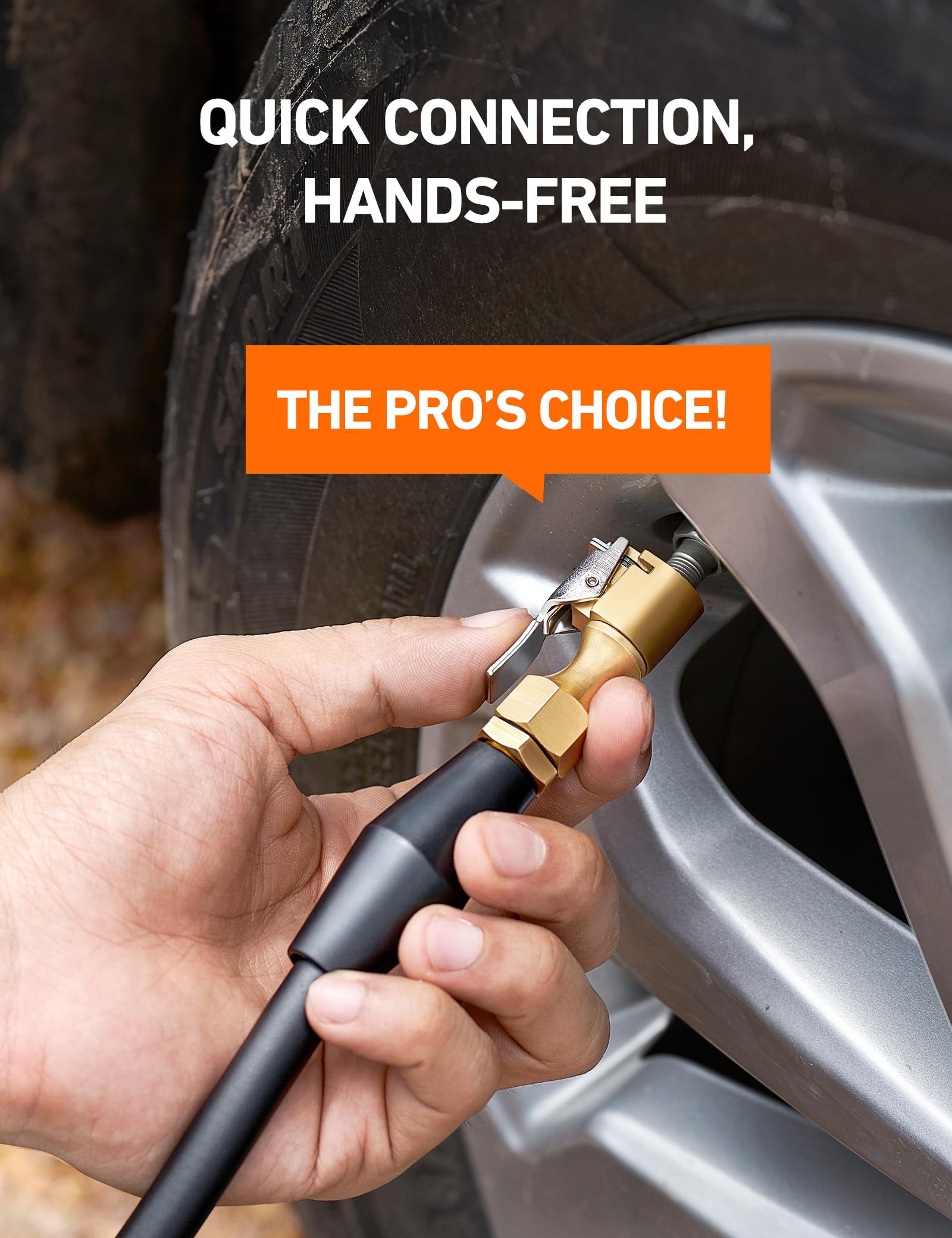 • HEAVY DUTY STRAIGHT TIP makes filling tire hassle-free; the locking clip keeps the chuck attached to the valve stem during inflation