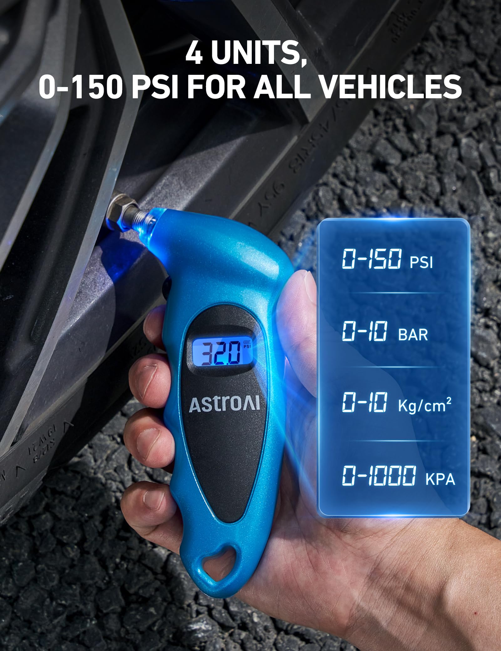 AstroAI Digital Tire Pressure Gauge 0-150PSI, Accurate in 0.1 Increments, Tire Pressure Gauge with Backlit LCD and Presta Valve Adaptor, 4 Units of Measurement for Car Truck Bicycle, Blue