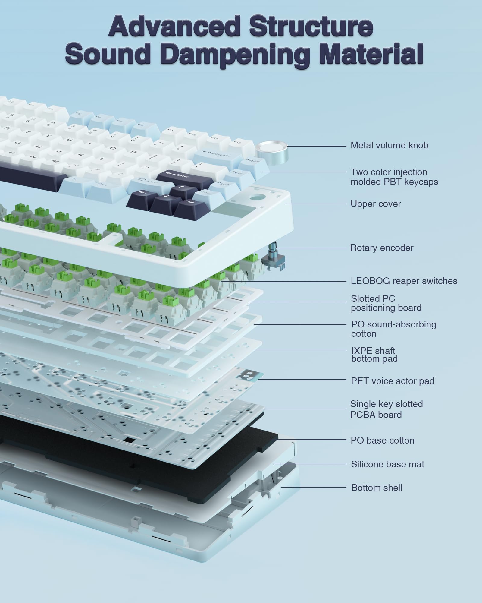 • Advanced Structure & PCB Single Key Slotting: This thocky heavy mechanical keyboard features an advanced structure, extended integrated silicone pad, and PCB single key slotting, better optimizes resilience and stability, making the hand feel softer and more elastic. Five layers of filling silencer fills the gap between the PCB, the positioning plate and the shaft,effectively counteracting the cavity noise sound of the shaft hitting the positioning plate, and providing a solid feel