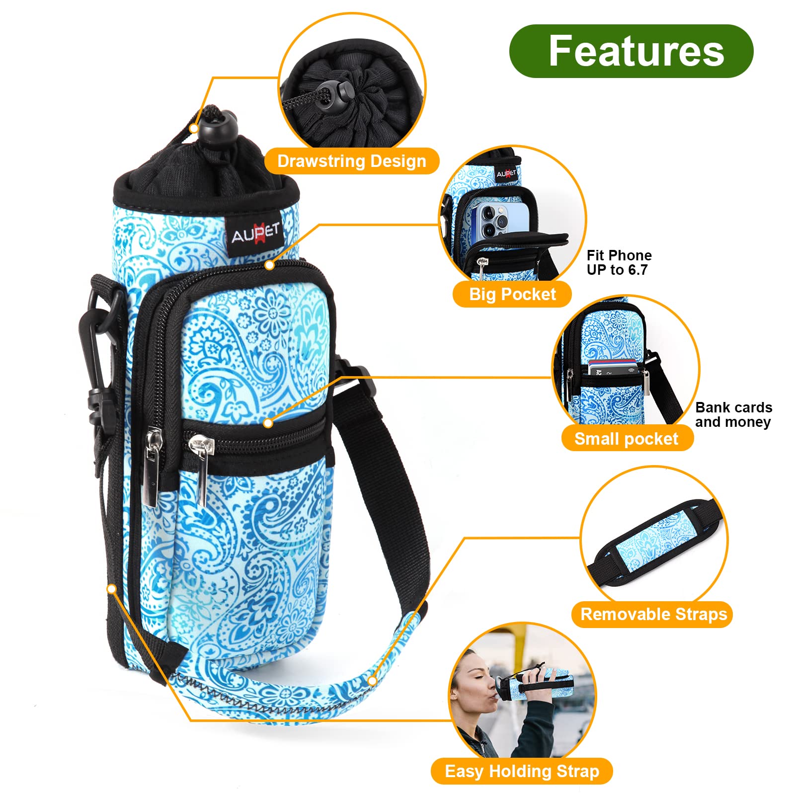 • AVAILABLE IN FOUR SIZES:Our AUPET water bottle crossbody bags has four sizes for you to choose,25oz/32oz/40oz/64oz,please refer to the picture to choose the right size