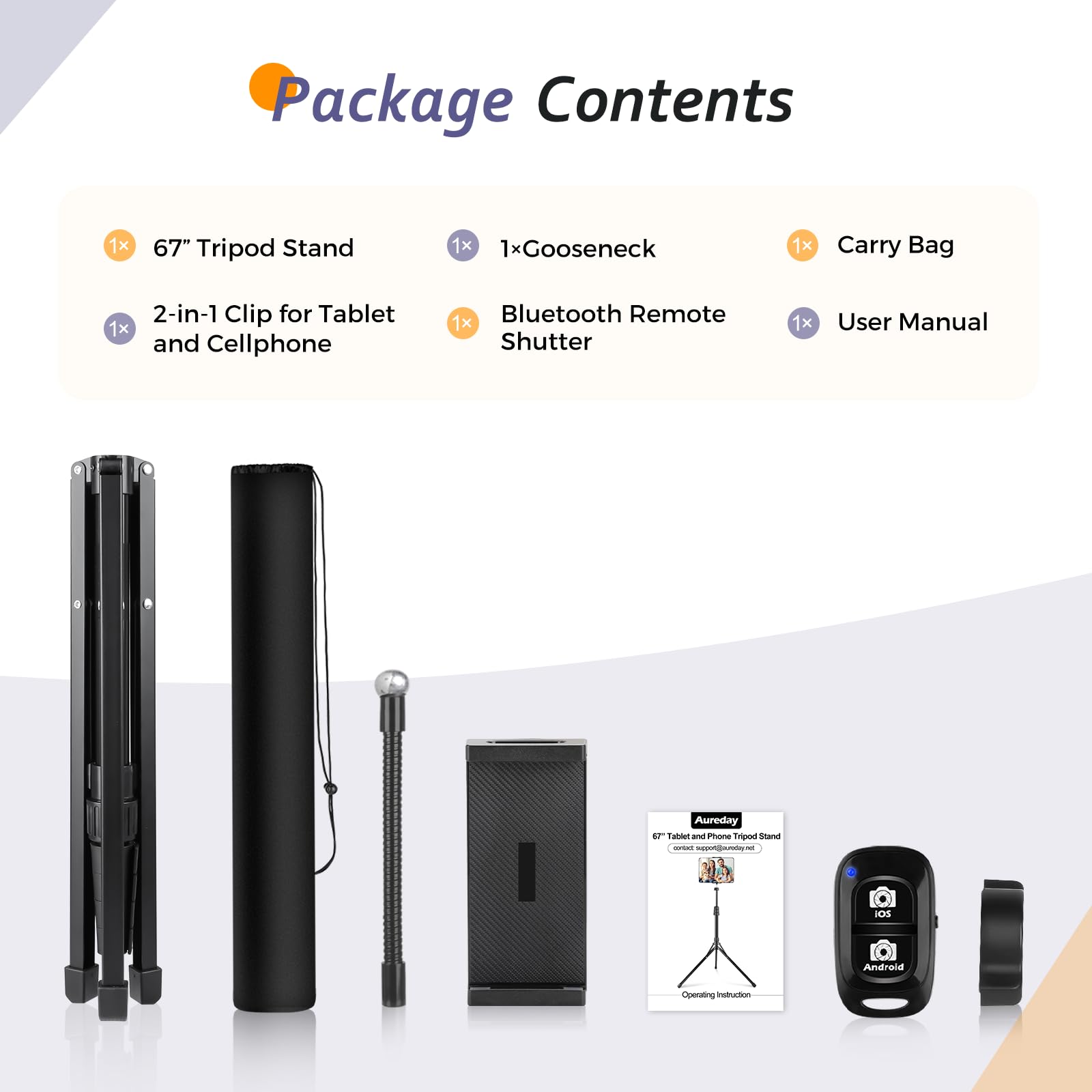 Aureday Adjustable Tripod Stand, 67” Height, Tablet Holder for iPad mini/Air/Pro, Kindle, Switch, Smartphones, 4.7”-12.9” Devices
