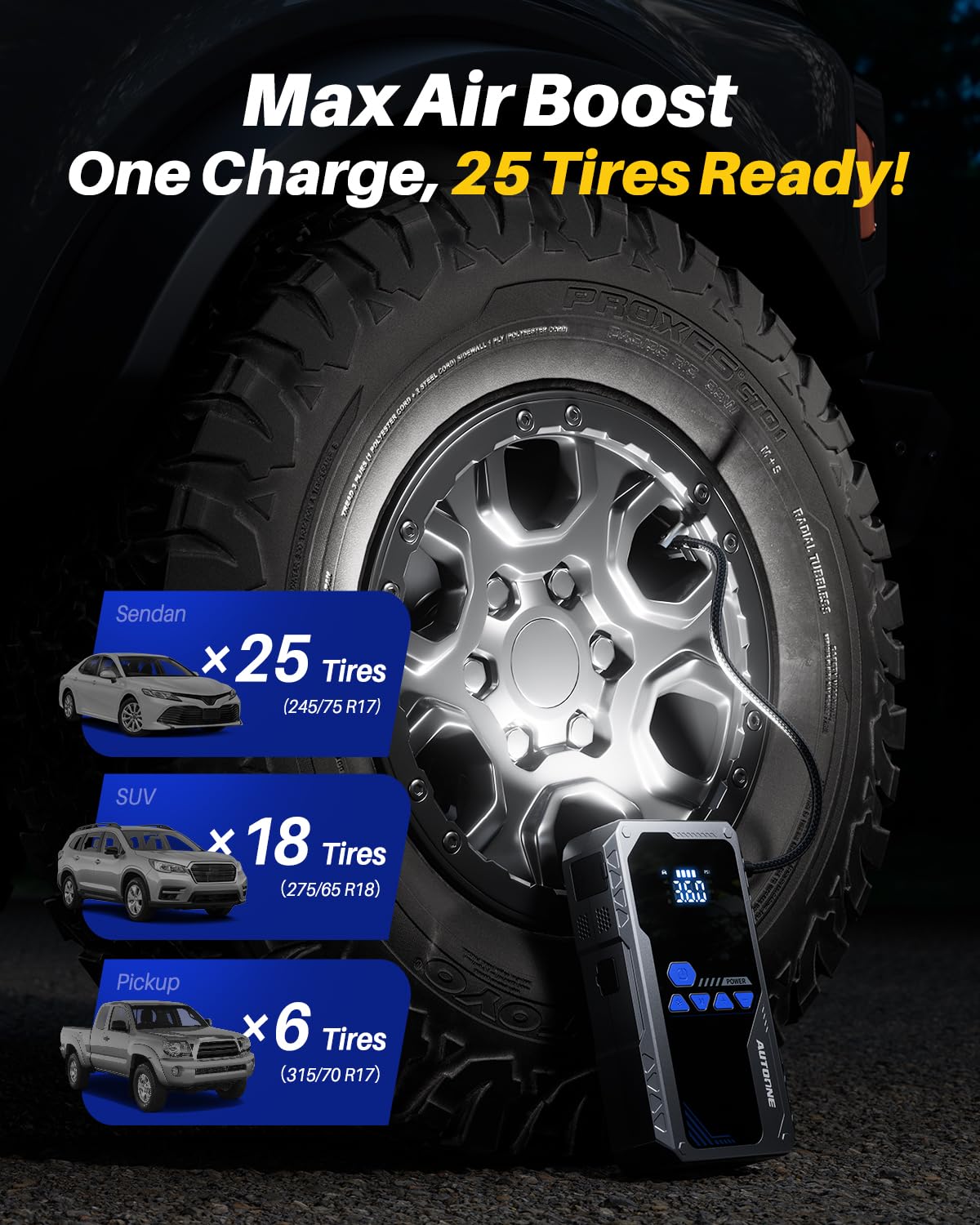• 【High-Performance Air Compressor】Integrated with a high-performance air compressor, this jump box for car battery inflates tires for cars, motorcycles, bicycles, and more at 45 liters per minute. It quickly boosts tire pressure, such as inflating a pickup truck tire from 30PSI to 36PSI in just 2.5 minutes, ensuring optimal tire performance on the go. This versatile car jump starter with air compressor meets all your inflation needs.