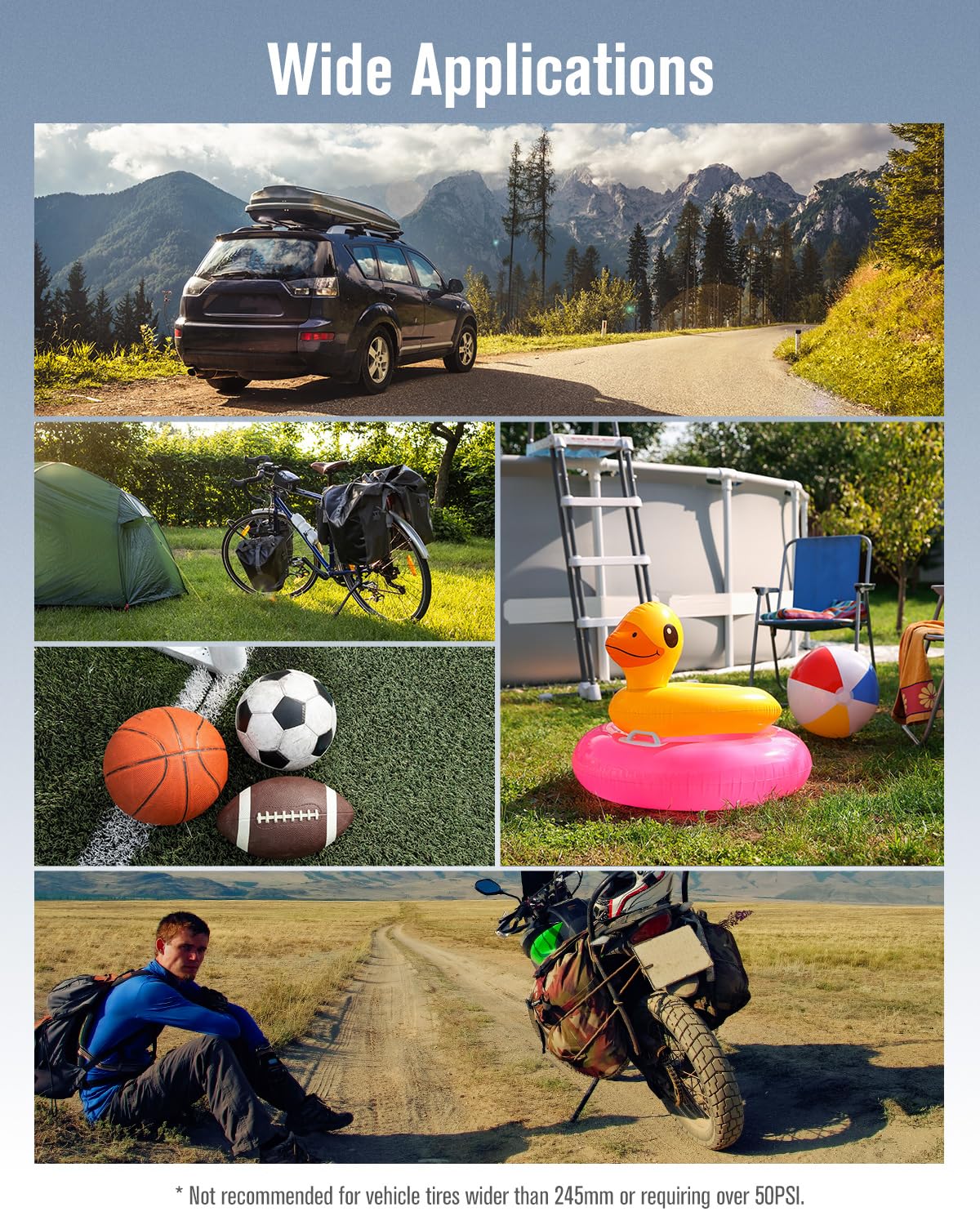 • [Multipurpose] This handheld air compressor is compatible with cars, motorcycles, bicycles, sport balls and small inflatable pool toys. Note: It's not suitable for high-volume inflatables, paddleboards, rafts. And not recommended for vehicle tires wider than 245mm or requiring over 50PSI