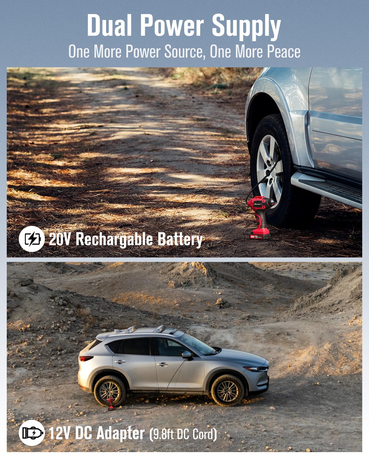 • [Dual Power Supply for Maximum Flexibility] Powered by a 20V rechargeable Li-ion battery or a 12V DC adapter (with a 9.8ft cord), this portable tire inflator for car gives you options. Never stress about a dead battery on the road—just plug it into your car’s 12V outlet for uninterrupted use. Perfect for roadside emergencies