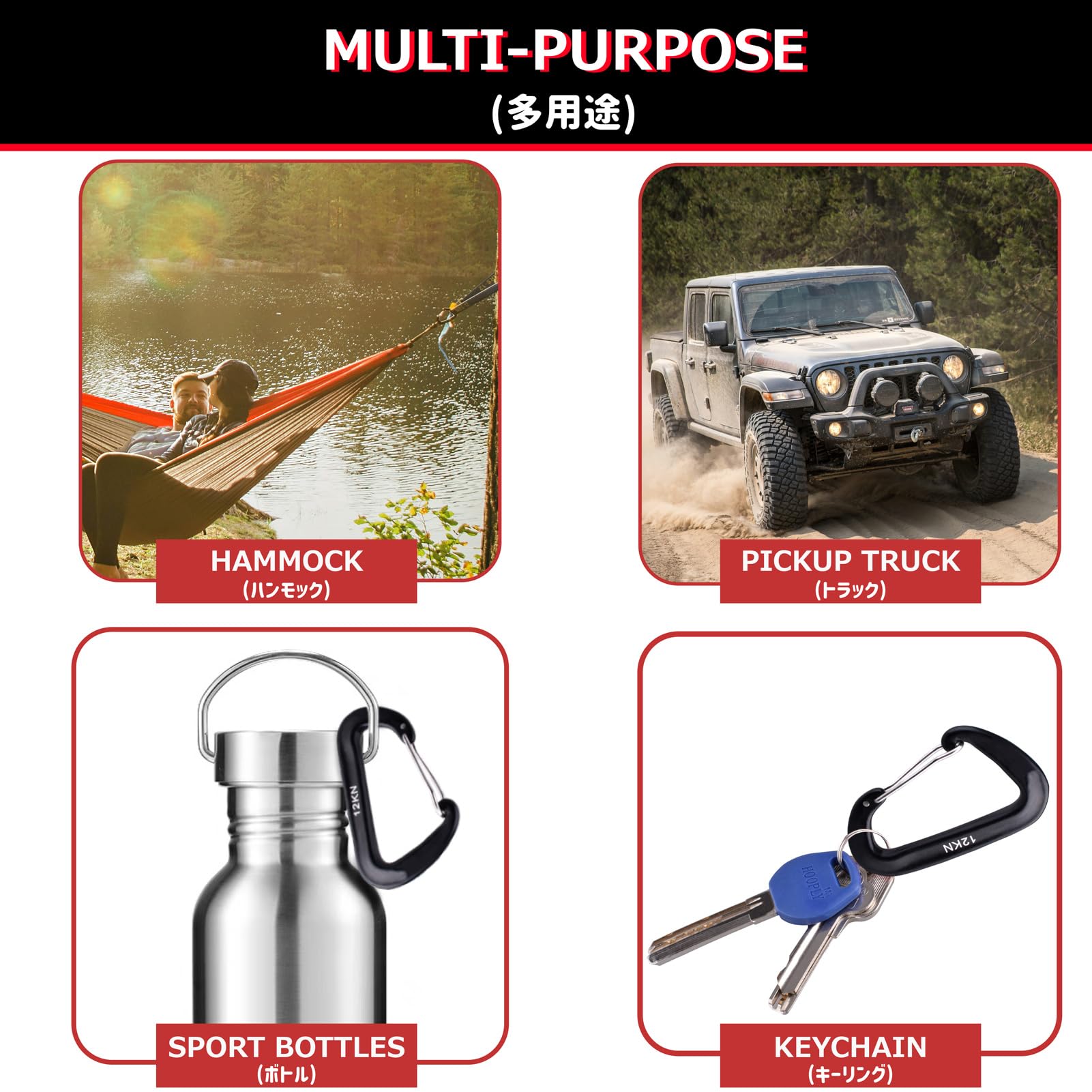 • Versatile Applications: Perfect for a wide range of uses, including securing outdoor hammocks, hiking gear, heavy objects in pickup trucks, or dog leashes. The secure locking system ensures your items stay safe and in place