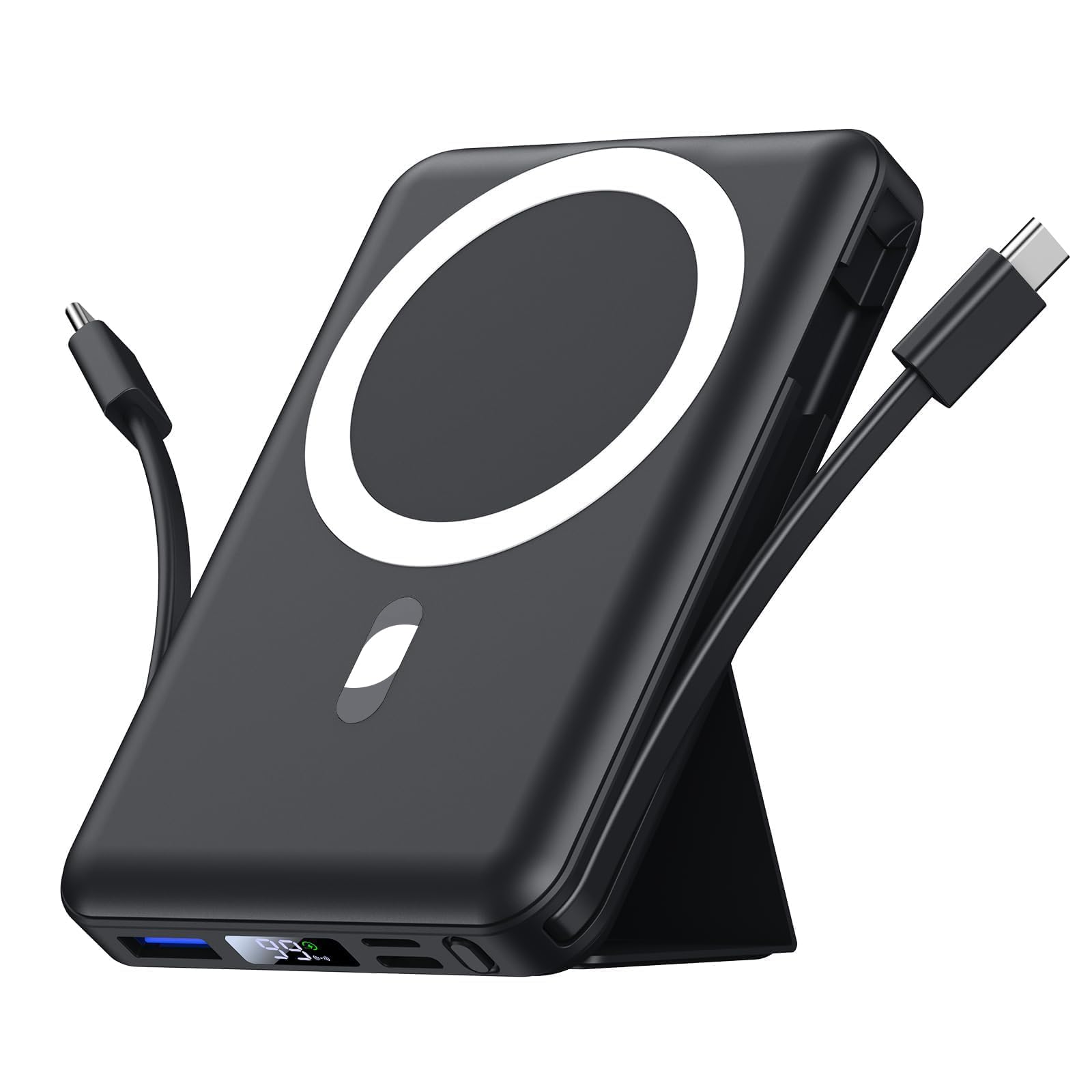 • 【Built-in TWO Cables & Foldable Stand】The portable travel charger for iphone has built-in USB C charging cables, perfectly compatible with iPhone or Type-C devices, no need to carry extra cables; The Magnetic Wireless Portable Charger Features a versatile built-in foldable kickstand can replace mobile phone stand that keeps your iPhone15/14/13/12 upright for a comfortable viewing angle.