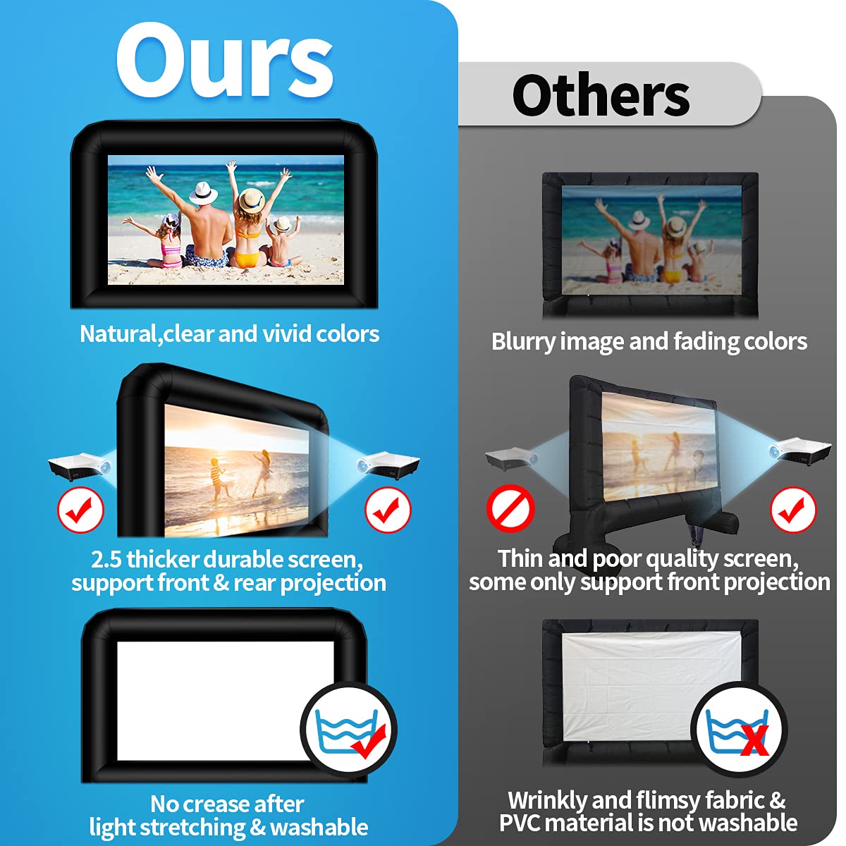 • [DURABLE MATERIAL] This inflatable projector screen is high-quality polyester materials, it is flexible, safe and smooth, without traces and no crease after folded. 210D Oxford cloth black frame features a seam-free, super stable and durable for use in all seasons. Easy to maintain and washable.