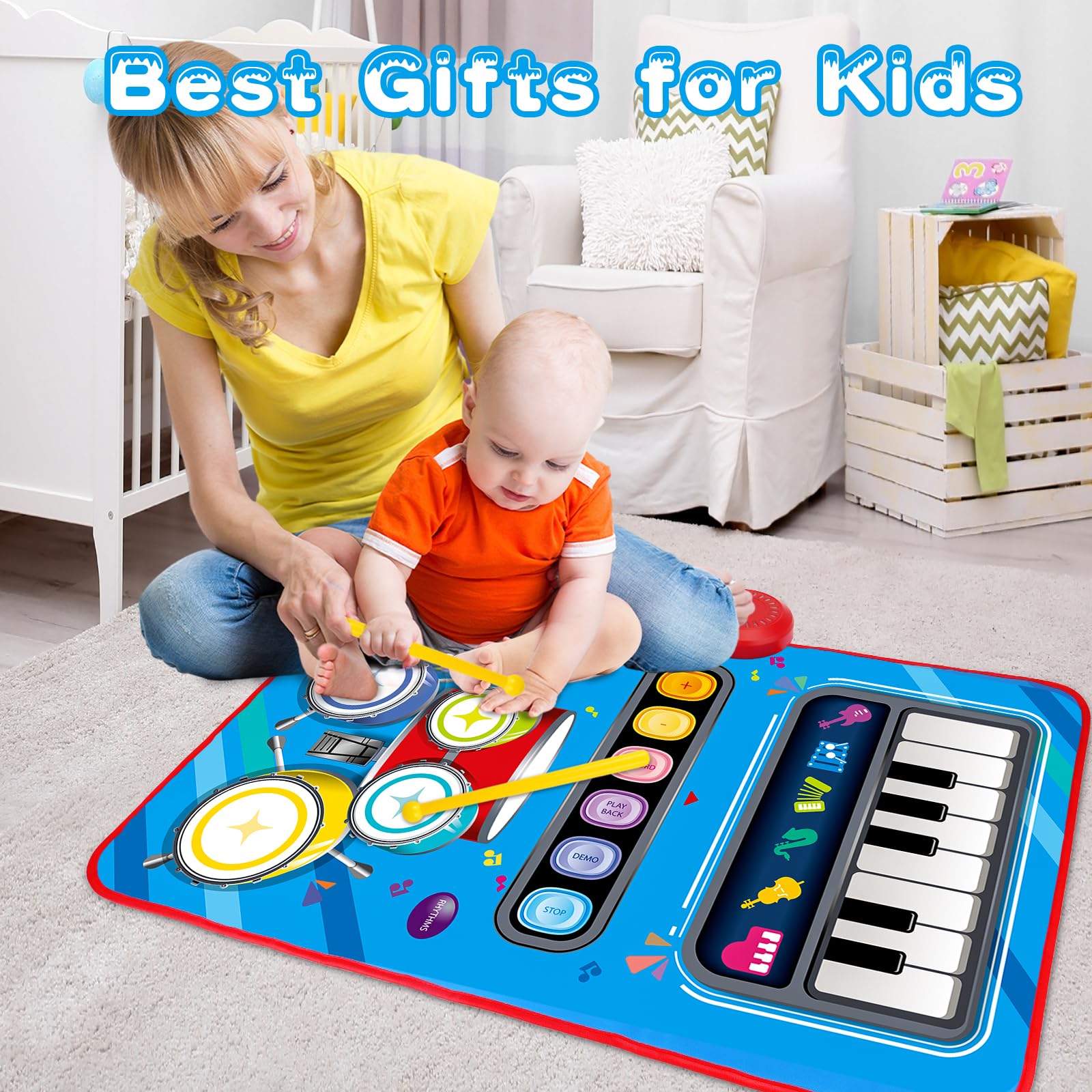 • MULTIFUNCTIONAL BABY TOYS: 2 in 1 Baby Music Playing Mat for 1 year old girl and boy help baby learn to play many different styles of music. The piano side has the sounds of 6 instruments (piano, violin, vibraphone, trumpet, accordion, guitar) and 13 piano keys. The drum side come with 2 drumsticks for fun drumming for 1 2 3 year old boys and girls enjoy playing the drum set. Wonderful piano play mat for baby, piano keyboard baby gifts, toddler valentines gifts, toddler easter gift idea.