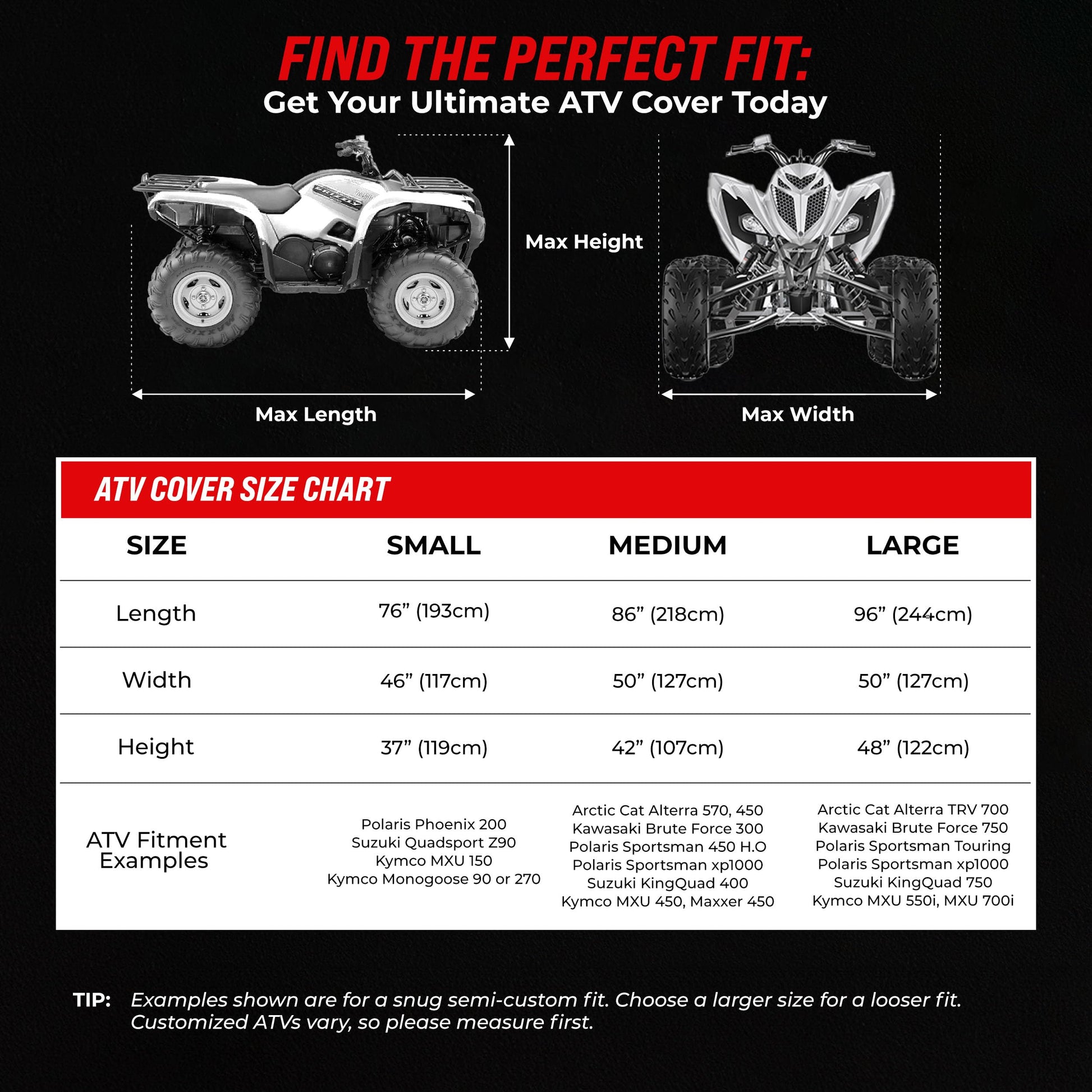 • UNIVERSAL ATV COVER FIT: Small ATV cover with 75' long size accommodates most popular ATV brands and models including small to medium ATVs, quads, and 4 wheelers. Features extra-strong elastic hems and secure tie-down strap system for snug fit on used and new ATVs. Ideal for adults seeking reliable ATV accessories, these heavy-duty waterproof ATV covers work excellently as outdoor cover protection for ATV, quad, electric ATV, and offroad vehicles in all weather and storage situations.