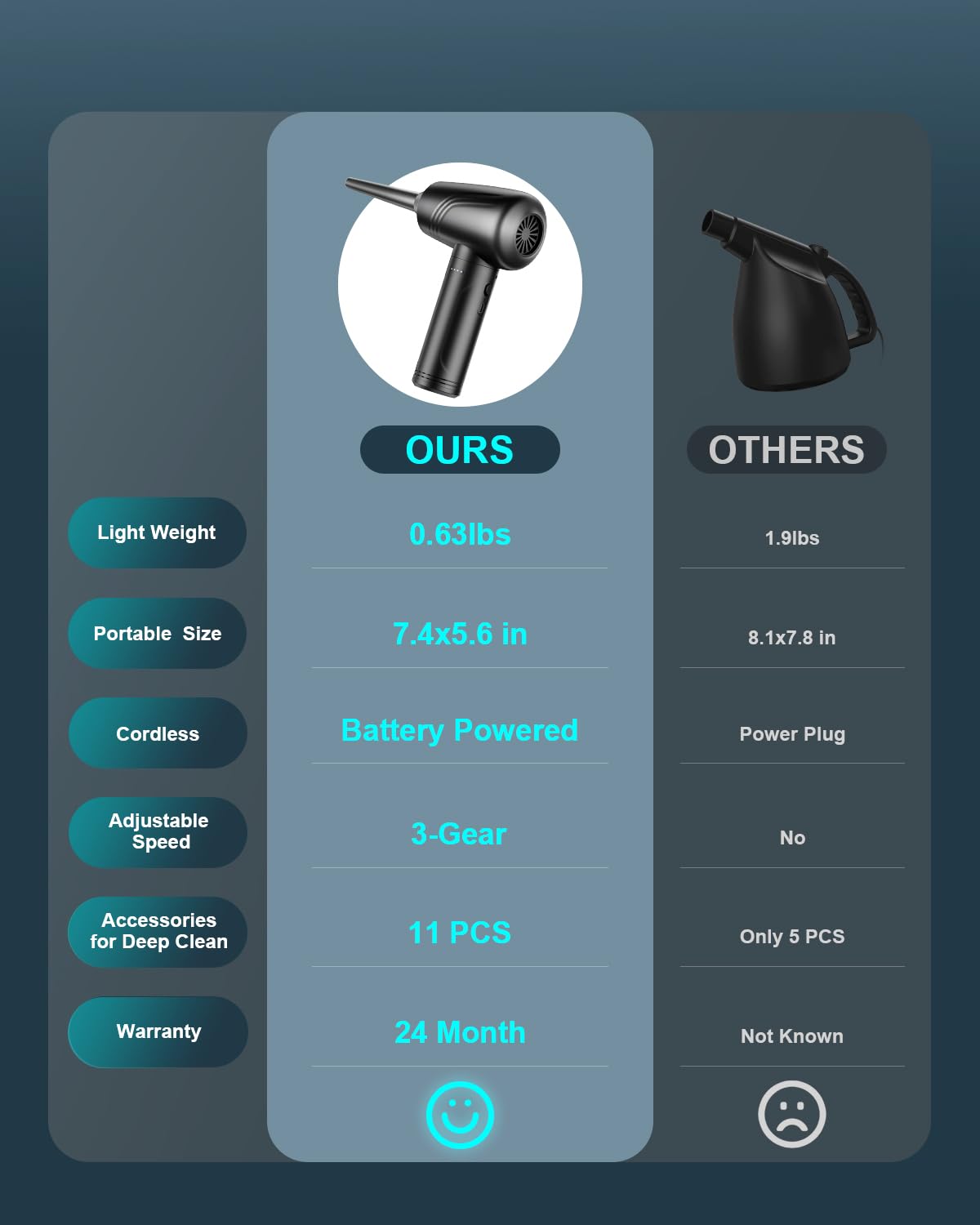 • Lightweight & Hassle-Free Cleaning: Tired of lugging around heavy cleaning gear? Unlike bulky, wired air dusters weighing 1.9lbs, our portable pc duster for laptop weigh just 0.63lbs, perfect for one-handed cleaning. With 11 attachments included, no dusty nook goes uncleaned. Plus, enjoy peace of mind with our 24-month warranty.