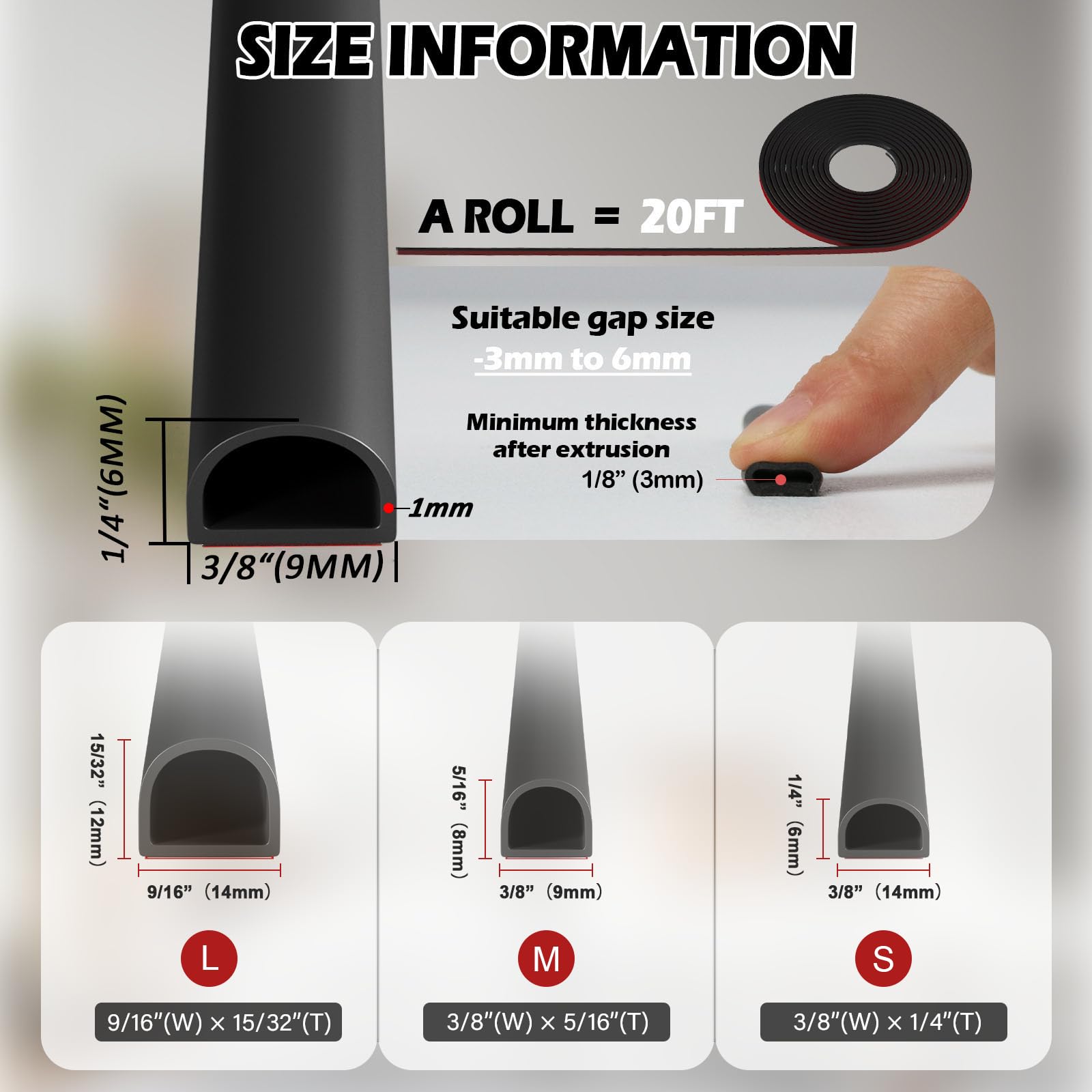 • Super Flexibility & Trimmability : The silicone material throughout the body ensures that the sealing strip is soft enough to flexibly handle any door and window gap.Garage and door bottom can also be used.A roll of 20FT size is suitable for most doors and windows, and can be cut in any length.The optimal gap range for use is 3mm~6mm