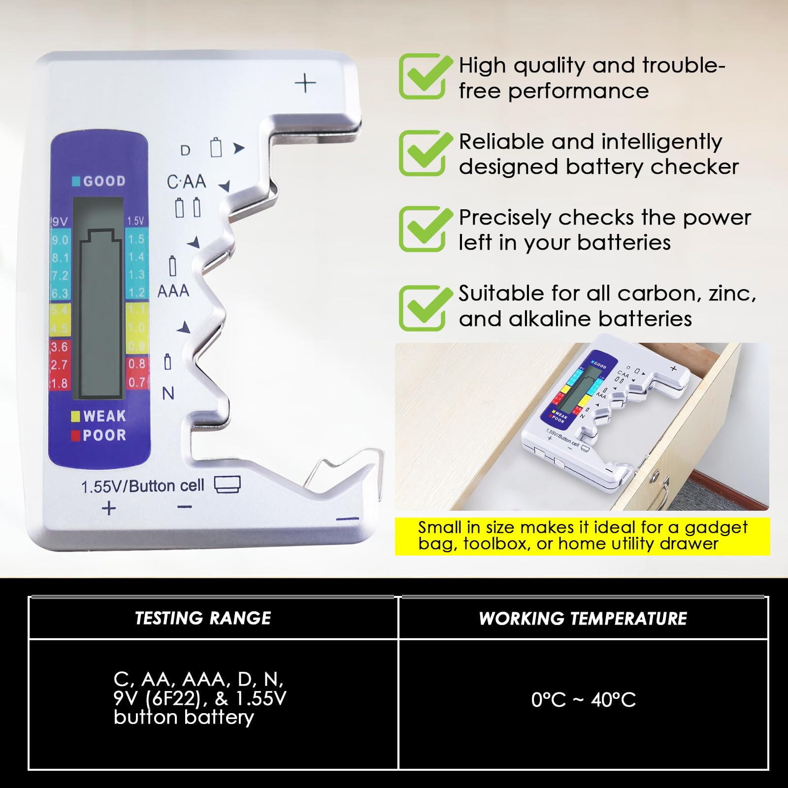 • PORTABLE AND COMPACT: Our Battery tester checker that is small,Made with durable ABS and stainless steel.lightweight, and simple but efficient to use.Working Temperature: 0°C-40°C,size makes it ideal for the gadget bag, toolbox, or home utility drawer