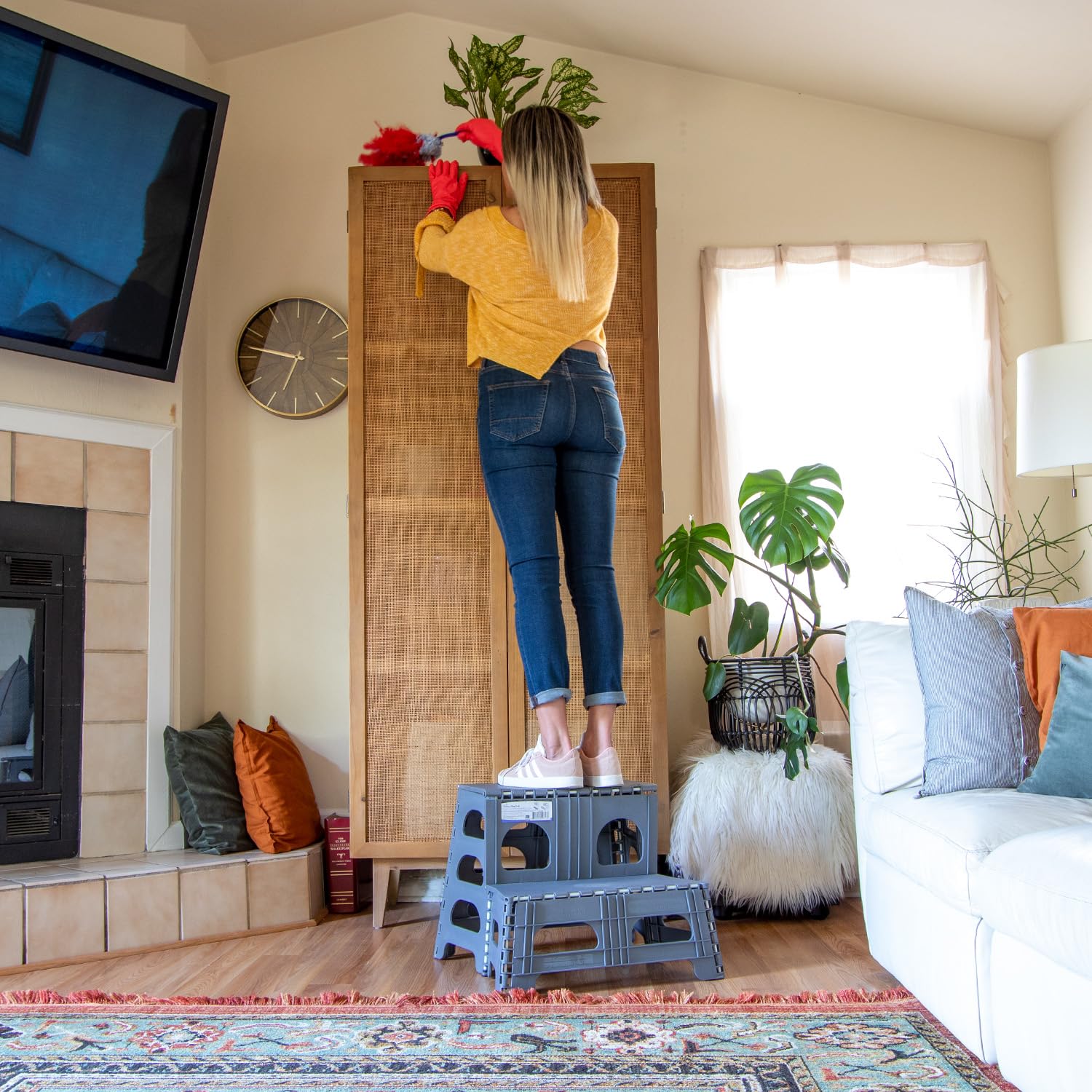 • Compact Foldable Stool: Our foldable stool can easily fit into tight spaces or cars. You can store it under the sofa or bed, or vertically between a wall and an appliance or furniture when not in use.