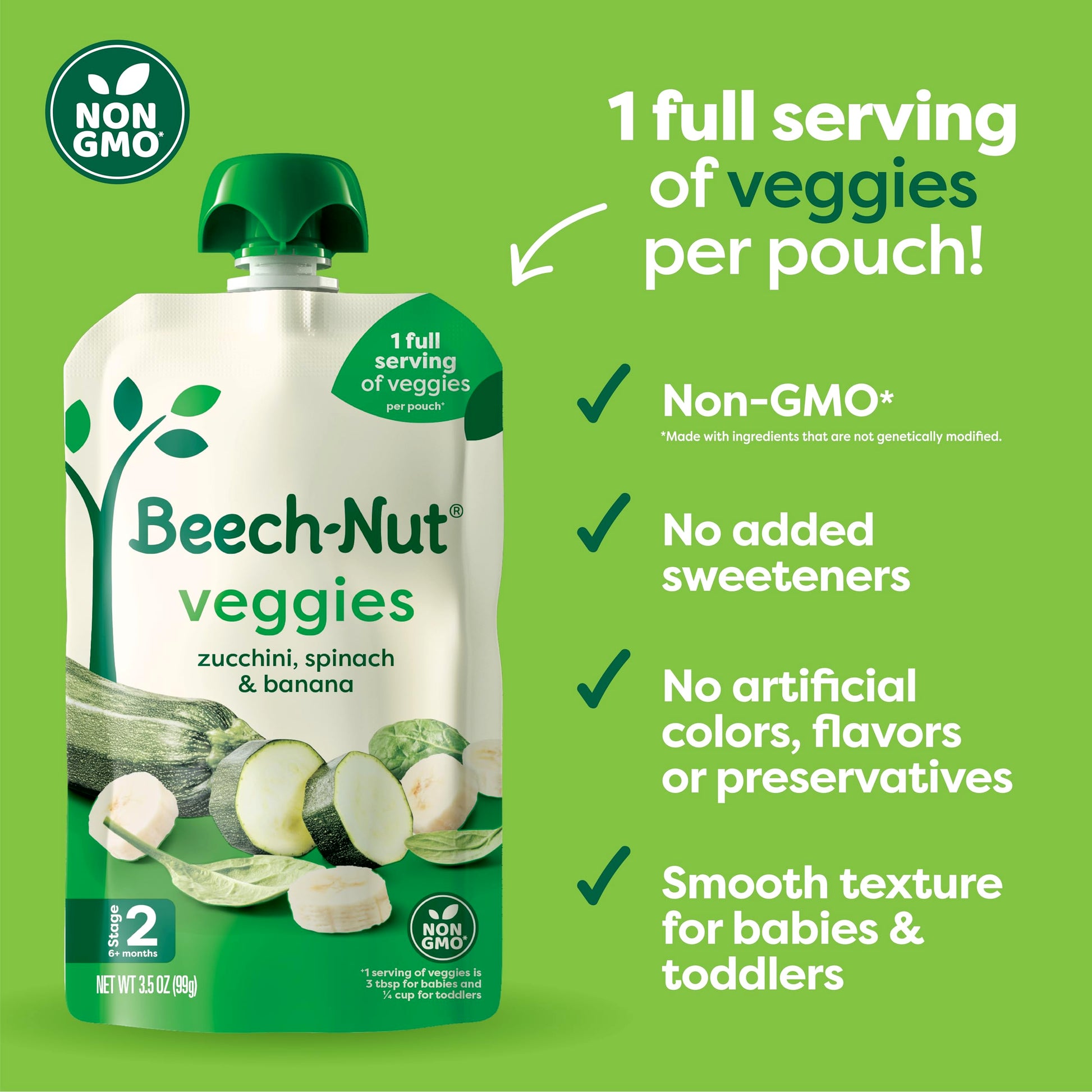 Details: Beech-Nut Baby and Toddler Food Pouches are made with real ingredients and packed in convenient pouches for on-the-go feeding. This Beech-Nut Veggie Blends Variety Pack contains (6) Squash, Peas & Pears, (6) Zucchini, Spinach & Banana, and (6) Pumpkin, Zucchini & Apple baby food pouches. Our blends contain real fruits and veggies. Beech-Nut baby food pouches are a delicious way to squeeze more fruits and vegetables into your little one's day. This Stage 2 puree is ideal for your baby 6 months and up.
