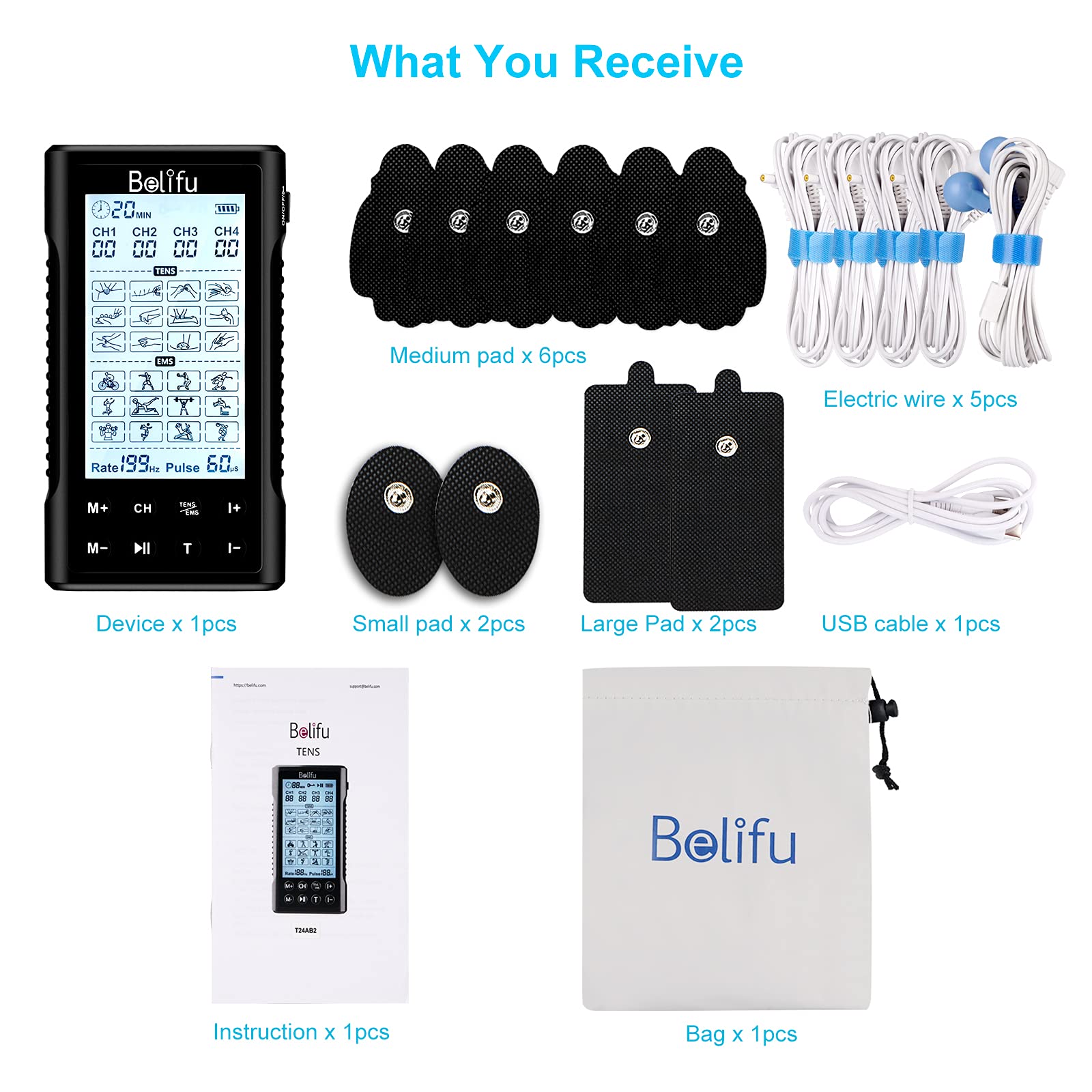 Belifu 4 Independent Channel TENS EMS Unit, 24 Modes,30 Level Intensity Muscle Stimulator Machine, Rechargeable Electric Pulse Massager with 10 Pads&5 Set Leads Wires, for Pain Relief Therapy(Black)