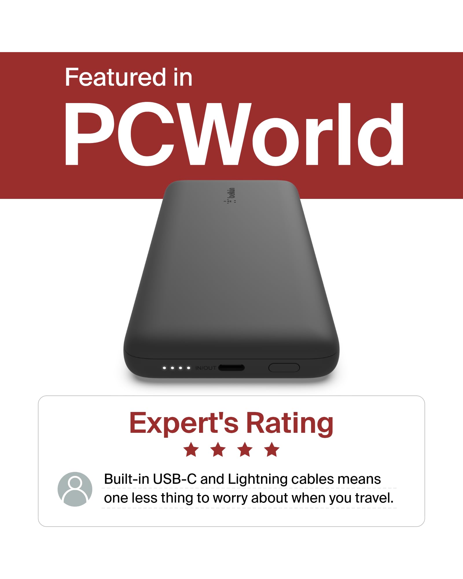 Details: The Belkin BoostCharge Plus Portable Charger Power Bank is the perfect way to charge your smartphones and tablets on-the-go. The BoostCharge 10k mAh portable charger features a built-in lightning cable (MFi) and USB-C cable so you can recharge your favorite devices without having to worry about separate cables. The convenience doesn’t stop there, because Belkin BoostCharge Plus also supports pass-through charging*, which allows you to charge both your power bank and connected device at the same time with up to 18W. With a super high capacity of 10,000 mAh, the battery pack can keep your devices charged all day. And you will always know when your power bank needs to be charged, with the onboard LED indicator light quickly and easily displaying the battery status of your portable charger.
