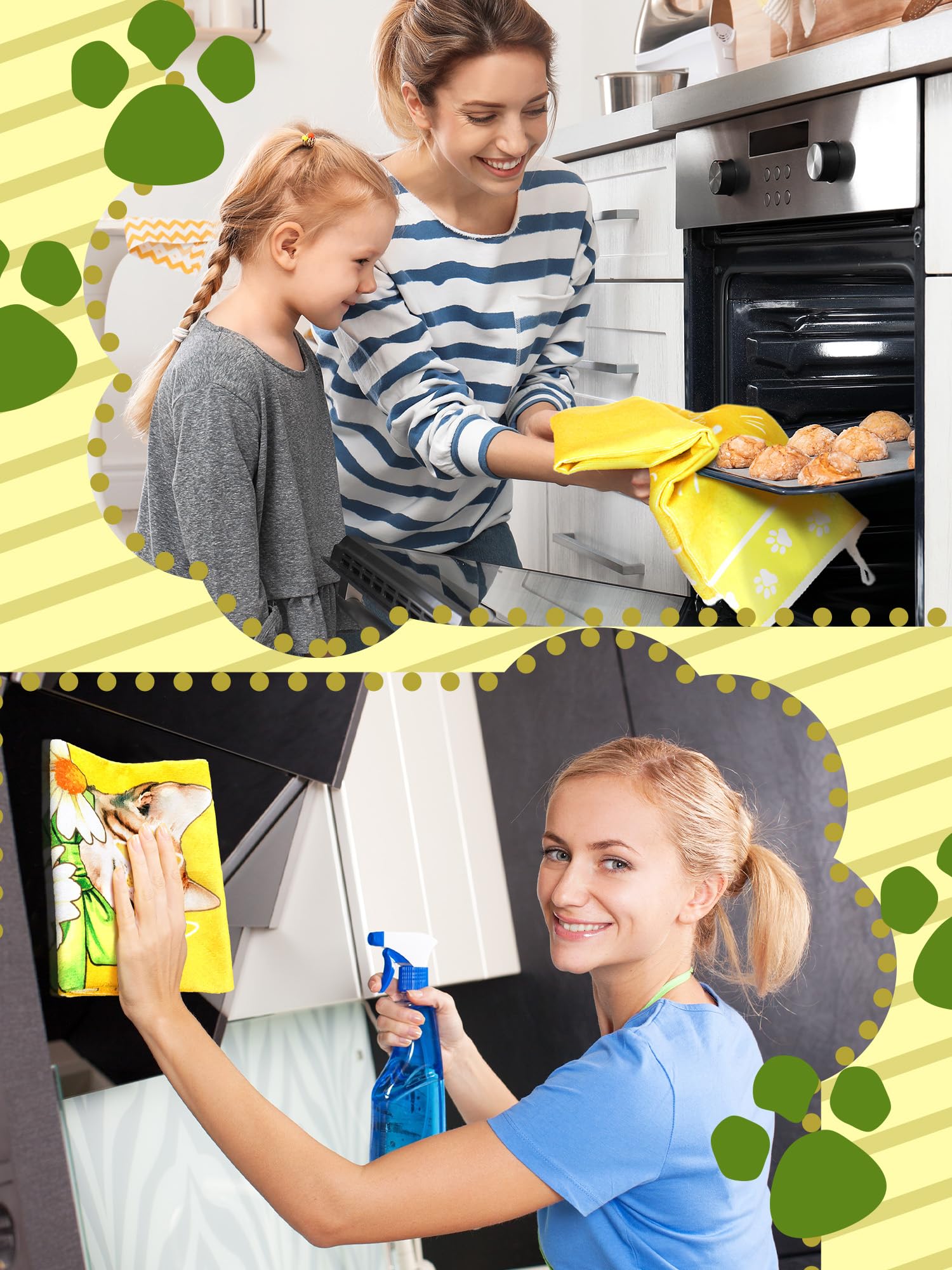 • Cat Themed Design: each kitchen towel is printed with cat and flowers, cute and lovely, the main yellow and white colors create a fresh and comfortable seasonal atmosphere, adding bright color to your home and kitchen
