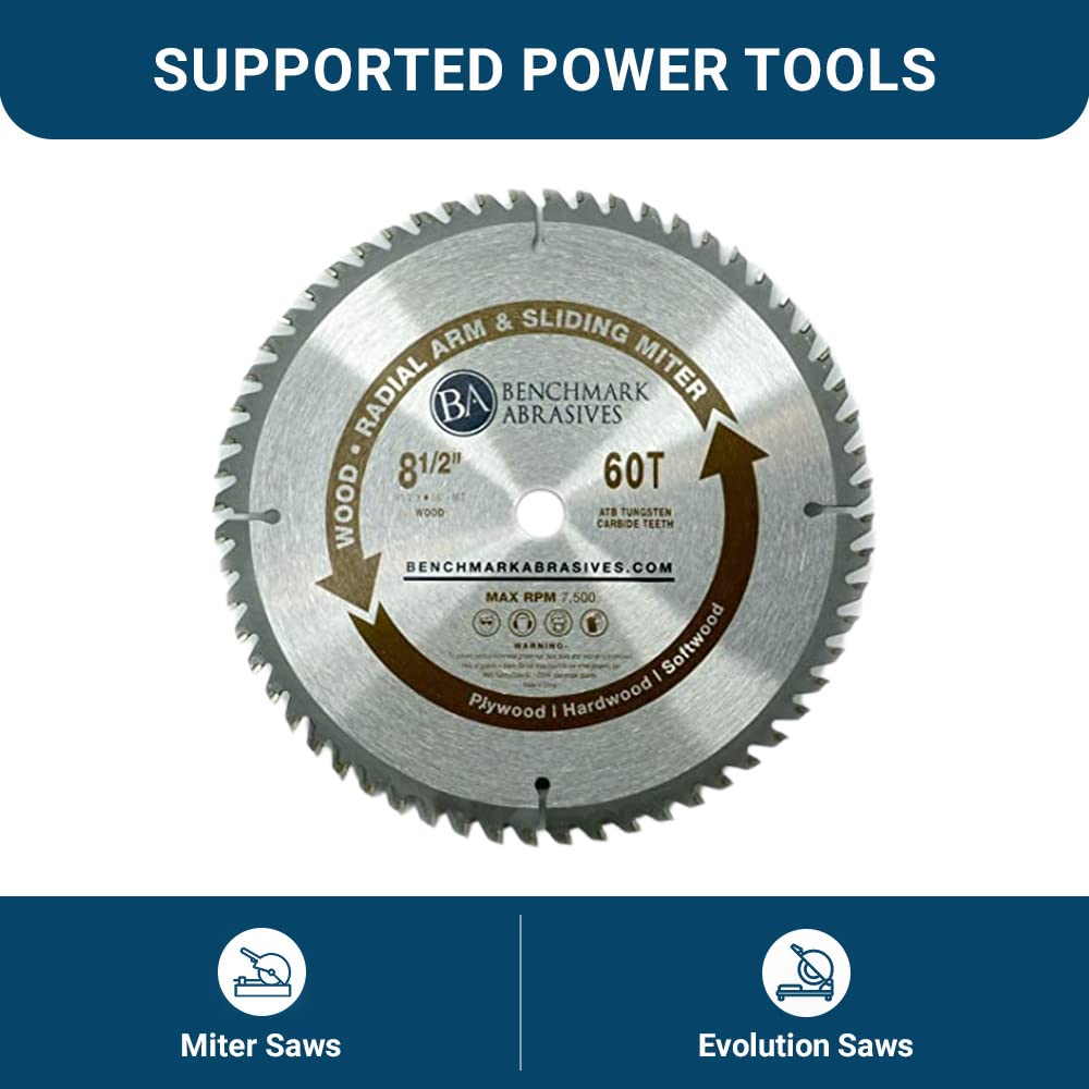 • MULTIPLE APPLICATIONS & COMPATIBILITY: Compatible with a miter saw and other circular saws. Designed to meet the high demands of industrial standards, our TCT saw blades offer quick and convenient installation. They are crafted from tough carbide material, which allows them to last through the toughest projects. The Benchmark Abrasives circular saw fits Evolution, Dewalt, Milwaukee, Makita, Bosch, Metabo, Ryobi, Skil, Big foot, 8 1/2 inch miter saws and virtually all other brands.
