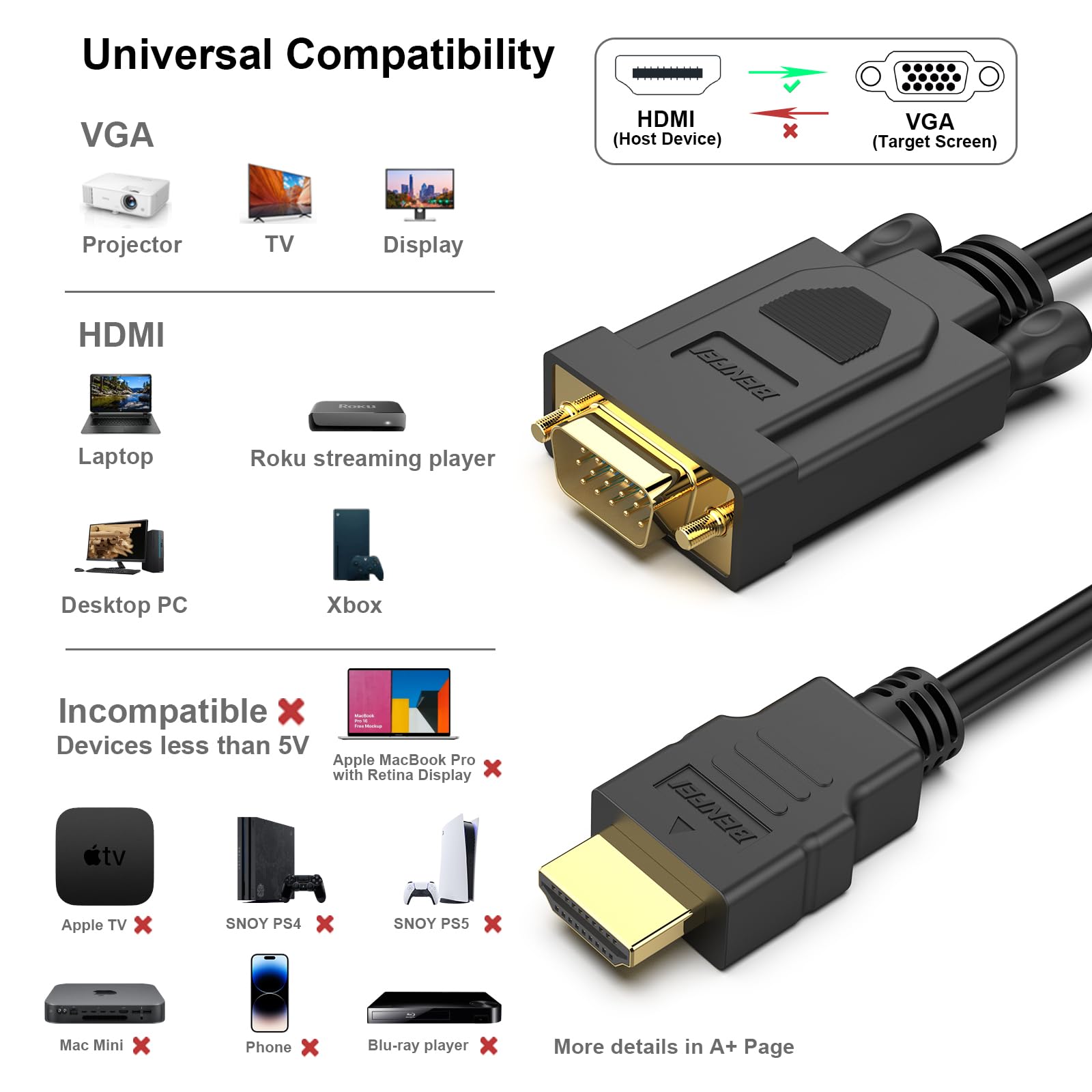 • SUPERIOR STABILITY - Built-in advanced IC chip converts HDMI digital signal to VGA analog signal; ✅ It is NOT a bi-directional converter and cannot transmit signals from VGA to HDMI