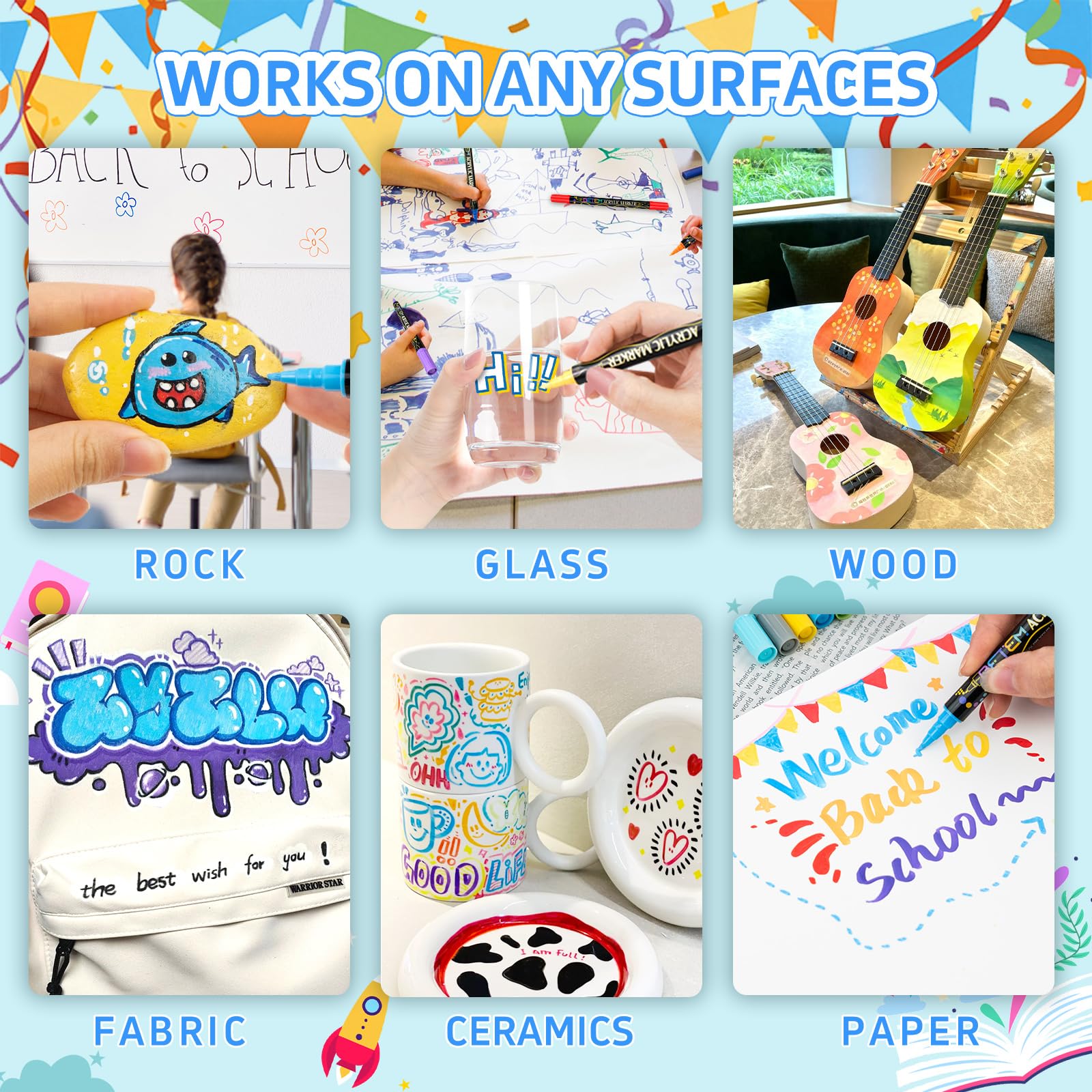 • Working on Any Surface: Our acrylic dual tip markers are suitable for use on almost all surfaces, including ceramic, wood, fabric, stone, metal, plastic, canvas, shoes, eggs, paper, clothes, models, leather, create DIY arts and crafts graffiti projects on a wide variety of surfaces to your heart's content