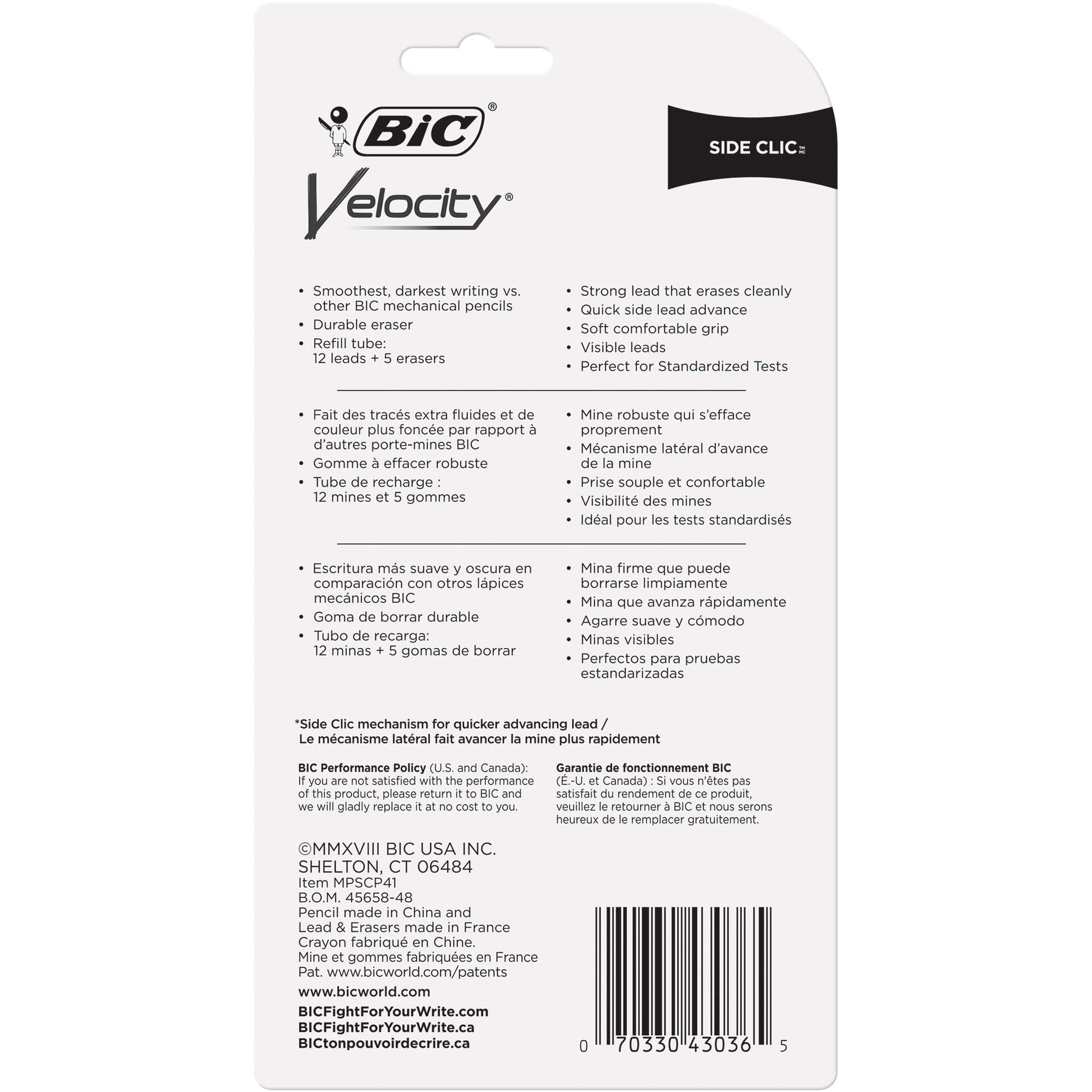 Details: Experience smooth, dark writing with BIC Velocity Side Clic Mechanical Pencils with Erasers. These 0.7mm mechanical pencils have a strong point that’s ideal for a variety of everyday writing activities. The strong lead doesn’t smudge and erases cleanly, so your work looks neat and professional. Convenient and reliable, BIC Velocity Side Clic Number 2 Mechanical Pencils 0.7 mm are always ready and never need sharpening; to advance the pencil lead, simply click the built-in eraser. These BIC pencils have a sophisticated, modern look, and their colorful clips easily attach to pockets, notebooks and more. The No. 1 selling mechanical pencil brand in the United States*, BIC offers dependable performance and value that you can trust. Looking for larger quantities of school or office supplies? Choose BIC Mechanical Pencils With Erasers for a high-quality, safe and affordable product you can trust. *Source: The NPD Group/Retail Tracking Service and Commercial Tracking Service, U.S., based on actual unit sales, 12ME June 2022 combined.