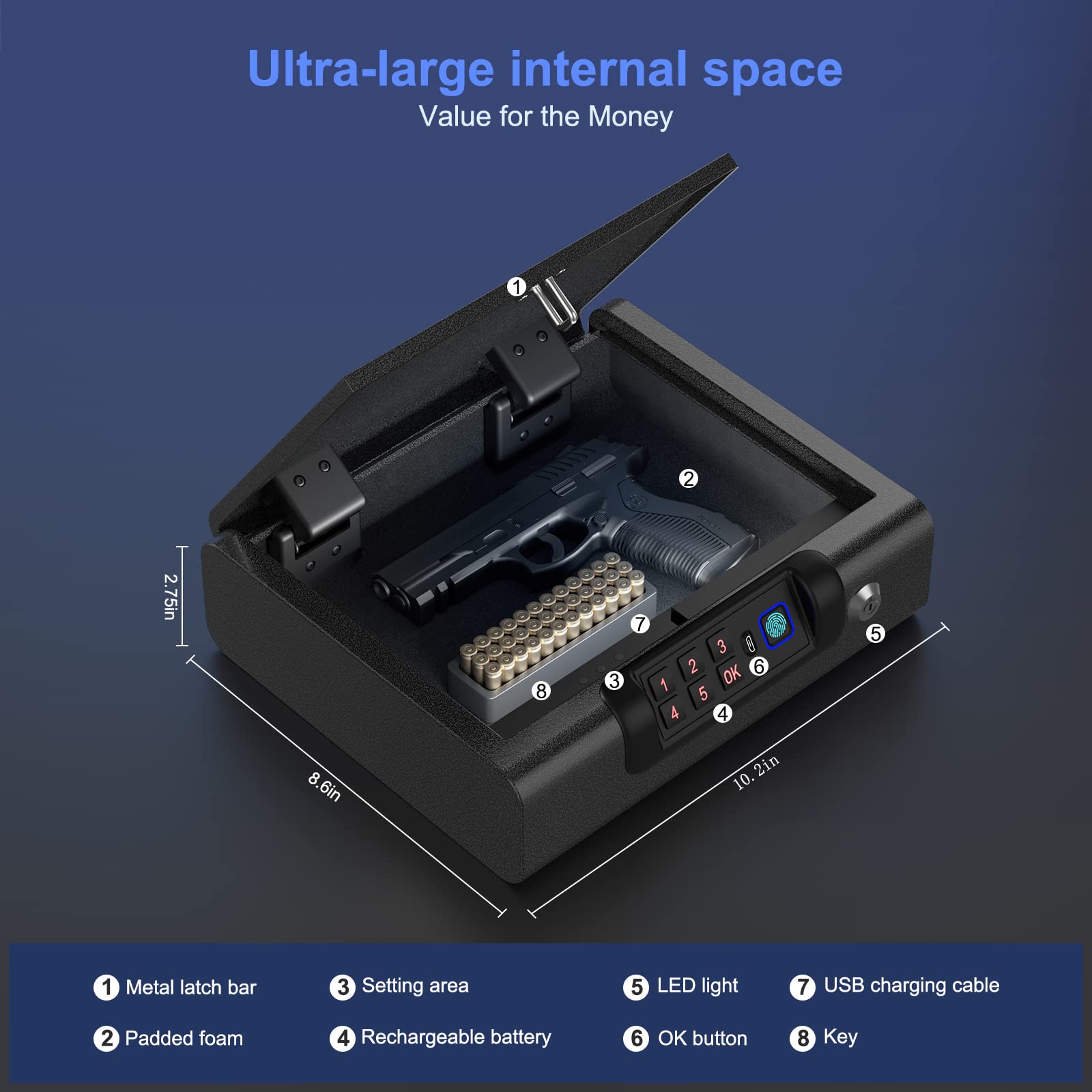 • BIOMETRIC ACCESS: The pistol safe is a biometric access/PIN access portable metal . gun safes for pistols is ideal for Pistols, cash and other valuable items. Top of the line biometric chips brings high security and access control system together and makes it safe and user friendly