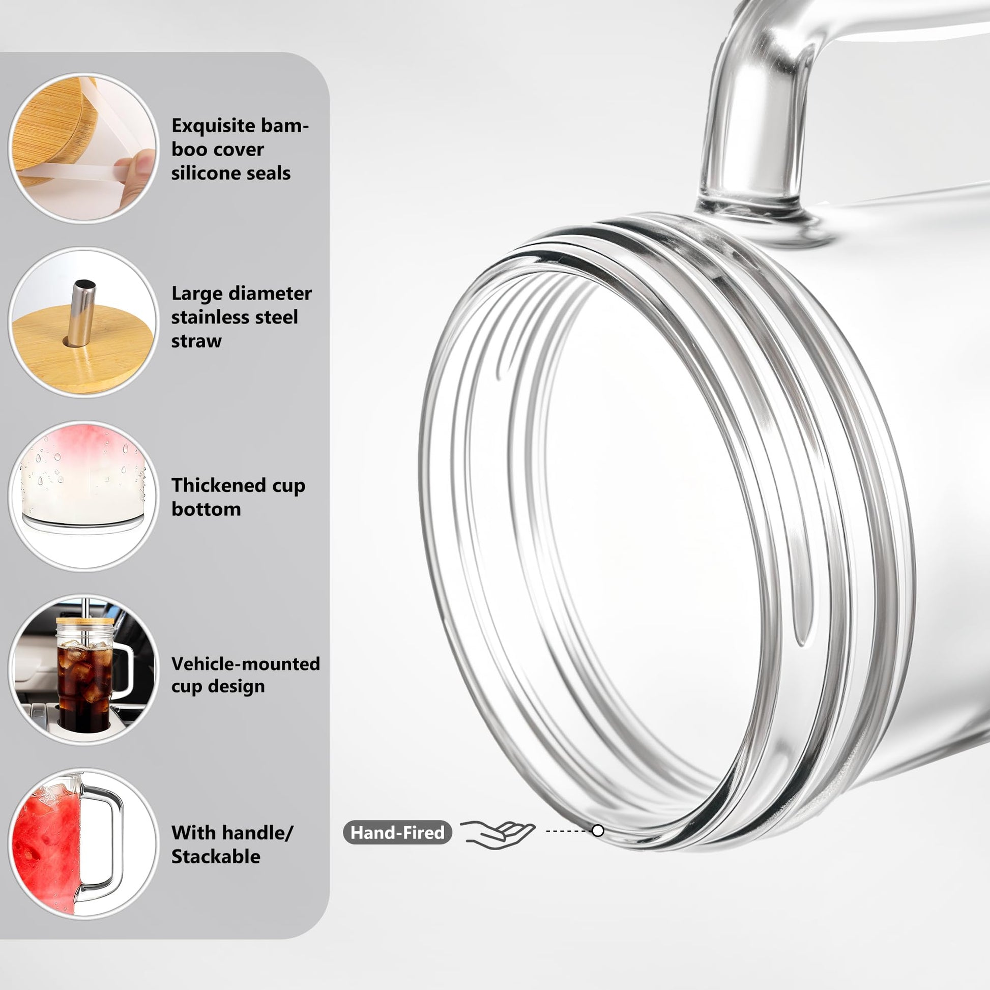 • TUMBLER WITH HANDLE AND STRAW LID: This Simple fashion drinking glasses with a smooth handle provides a comfortable grip, allowing you to comfortably hold your drink and take it anywhere, the glass cups with lids and straws is perfect for anyone who likes to stay hydrated A must-have, the 24oz tumbler with handle has a stainless steel straw, don't worry about the straw breaking during travel and sports