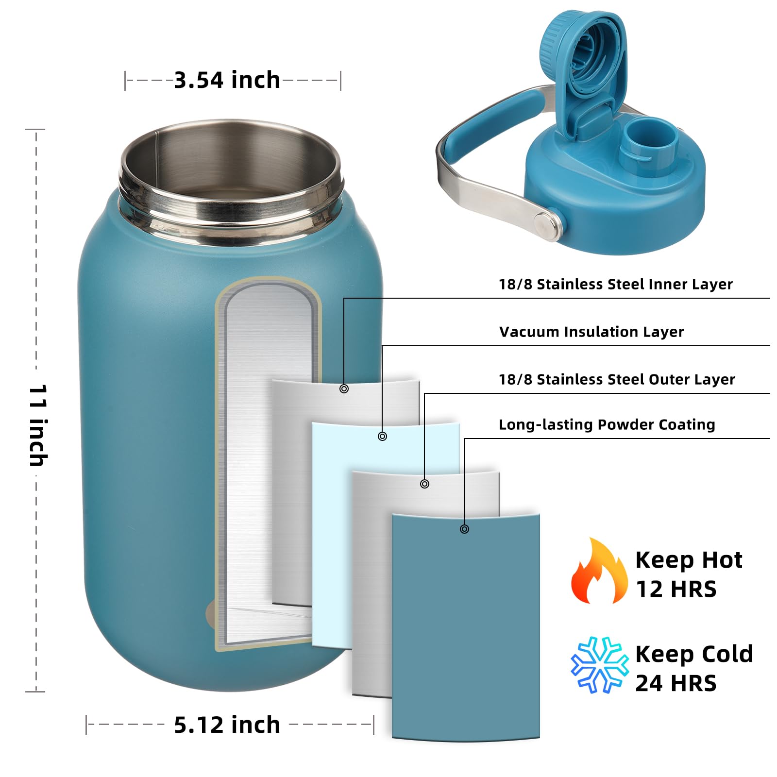 • INSULATED WATER BOTTLE: BJPKPK half gallon water bottle use double-walled vacuum insulation technology to keep your beverage cold for up to 24 hours, or hot for up to 12 hours, make sure you enjoy your favorite beverages at the most suitable temperature all day