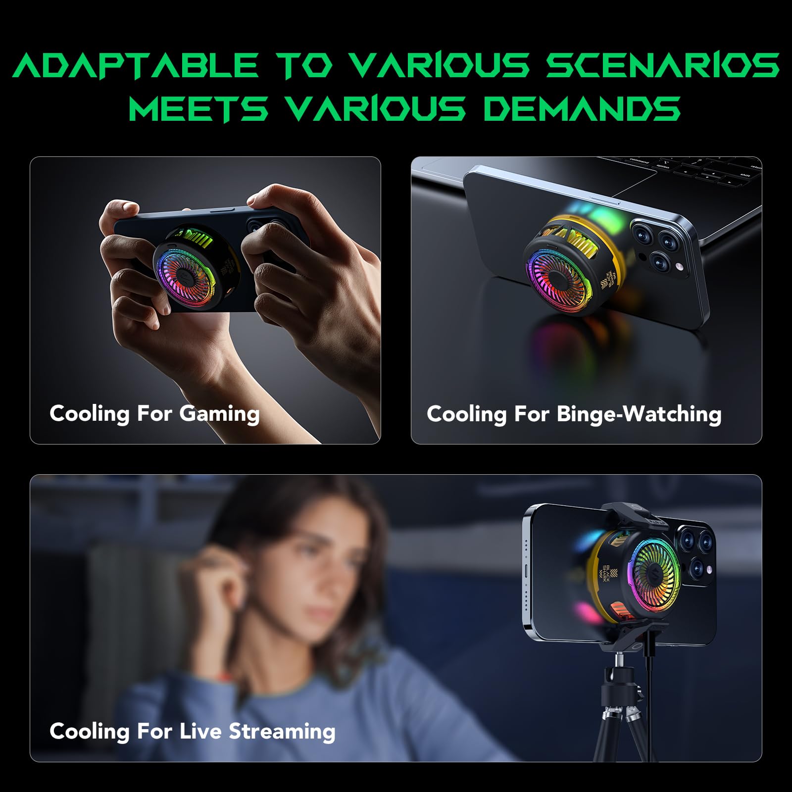 • 【Quiet Operation】This smartphone cooler adopts noise reduction design, and the operating noise in silent mode is only 30db, allowing you to play games or watch videos comfortably.
