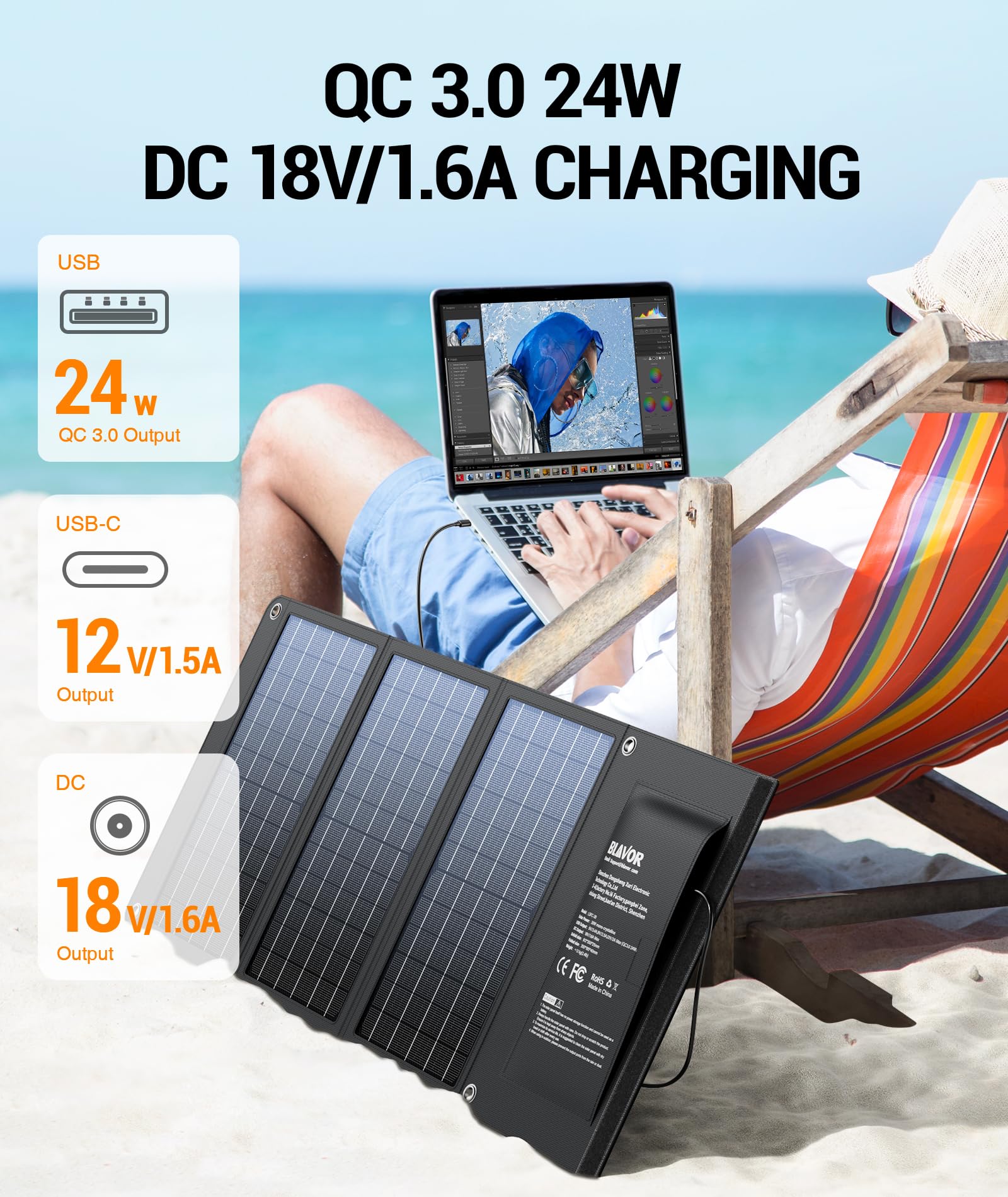 BLAVOR 30W Solar Charger USB-A QC3.0 24W USB-C DC 30W Outputs, Foldable Solar Panel for Camping, IPX4 Waterproof, Solar Battery Charger Compatible with Solar Generators, Phones, Tablets