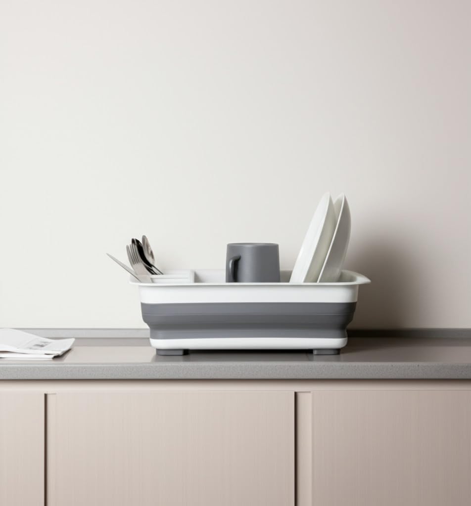 • For maximum drainage efficiency, place a washcloth, dishcloth, or kitchen towel underneath the dish rack when positioned on the countertop to absorb moisture. The rack features foldable and adjustable tray options for accommodating both large and small dishware while keeping them dry and safe. With silicone-coated, rust-proof components, it guarantees stain-resistant, scratch-proof, and fire-resistant qualities.
