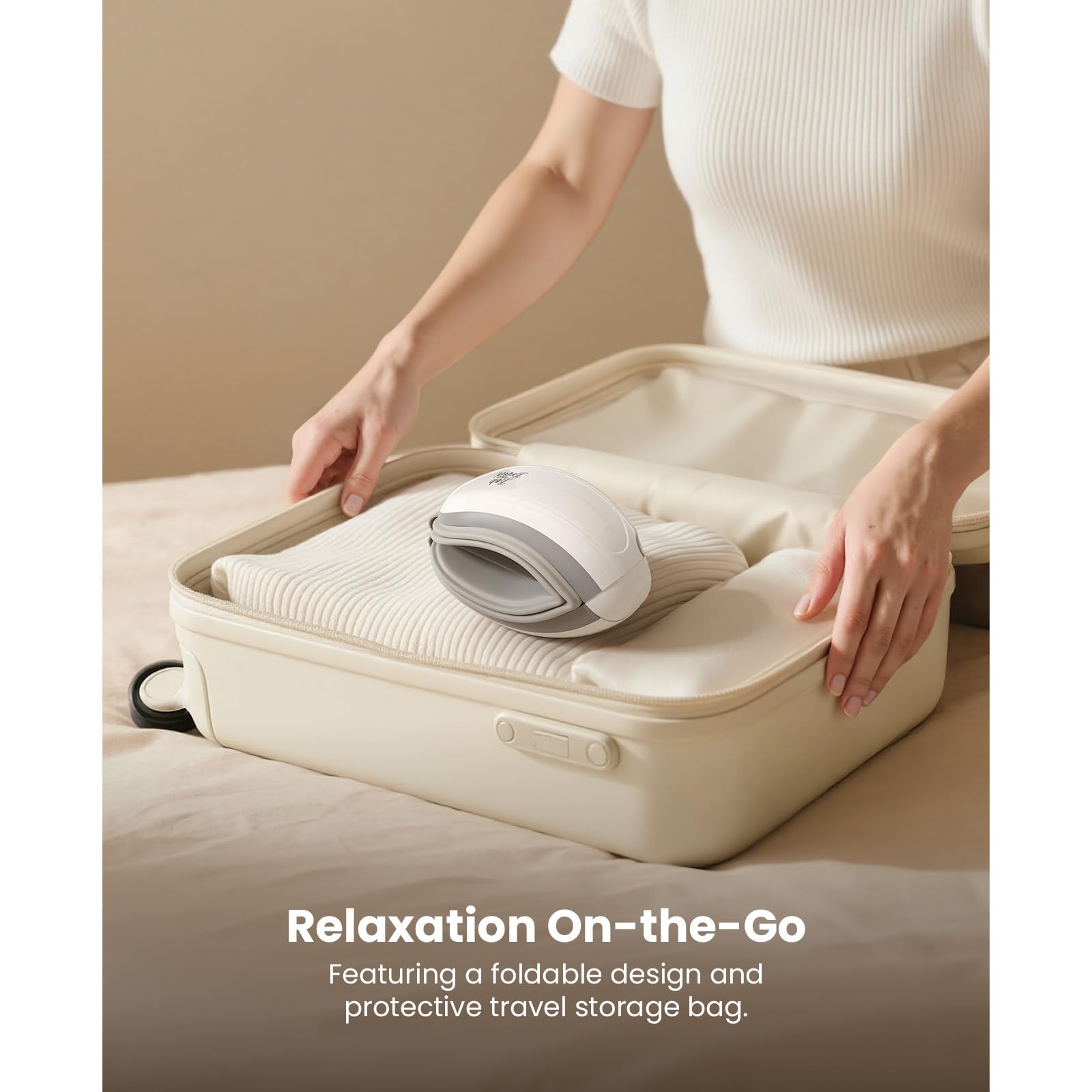 • Quieter Motor & Faster USB-C Charging - The upgraded eye massager features a high-quality motor with noise levels reduced to a whisper-quiet 45dBA, ensuring a peaceful and relaxing experience. This eye mask fully charges in just 2-3 hours and includes a 15-minute auto-shutoff for safety. With its foldable design and convenient travel bag, it's perfect for use at home, in the office, or on the go—whether you're traveling or in your car. Enjoy warmth, comfort, and relaxation wherever you are