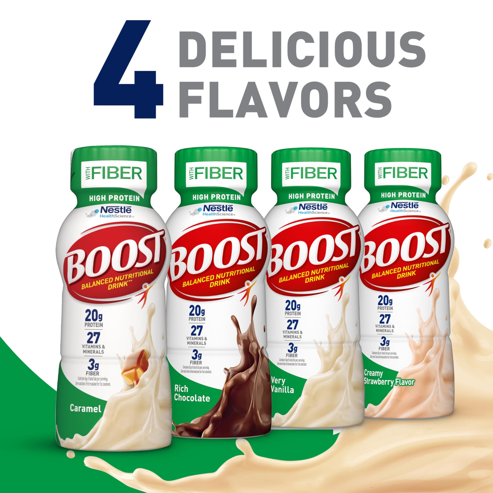 • BOOST High Protein with Fiber: BOOST High Protein with Fiber nutritional shakes have 20 grams of protein for muscle health, 3 grams of fiber for digestive health plus 27 vitamins & minerals with 240 nutrient-rich calories for energy.