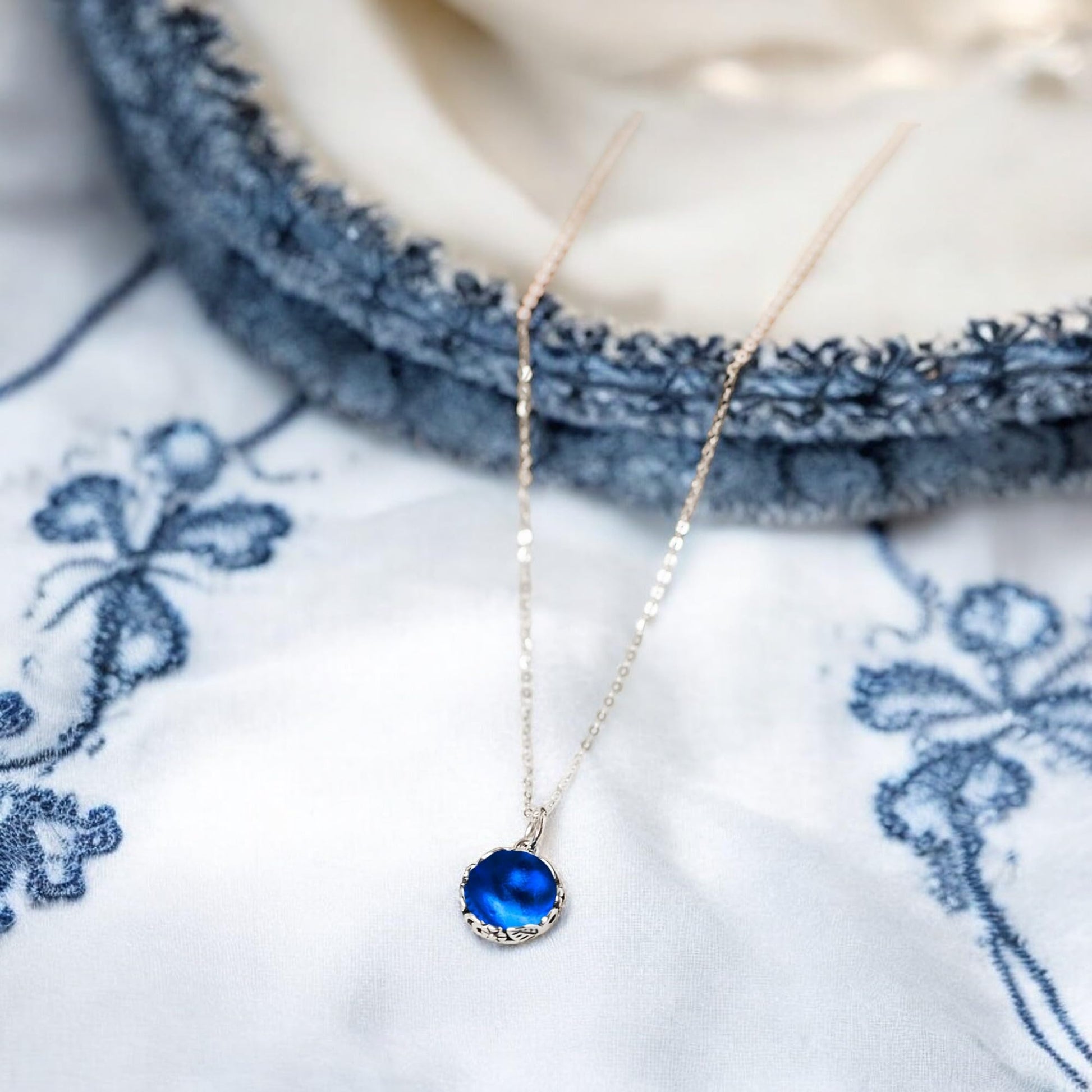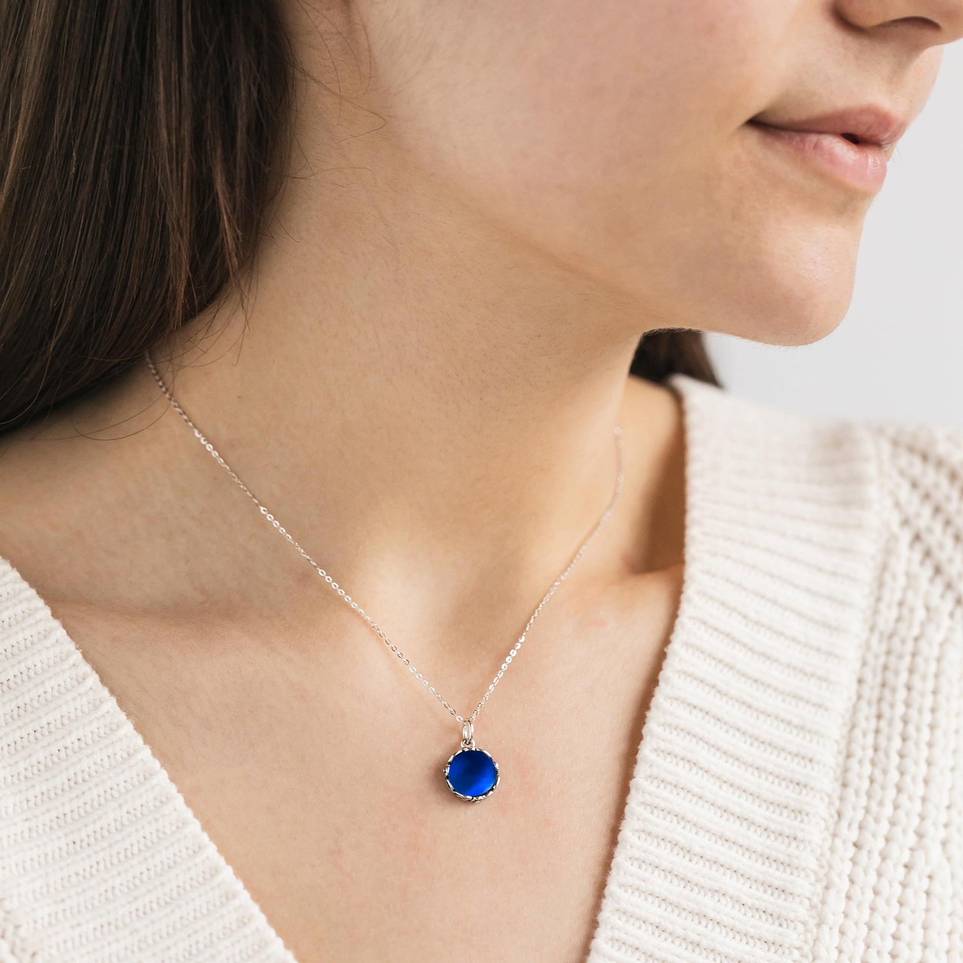 • Hanging from an 18' sterling chain, turn heads with this striking cobalt necklace, handmade from a recycled 1960s skin cream jar glass, paired with sterling silver. The vibrant blue shade adds a pop of color to any outfit, making it a standout piece for both day and night wear.