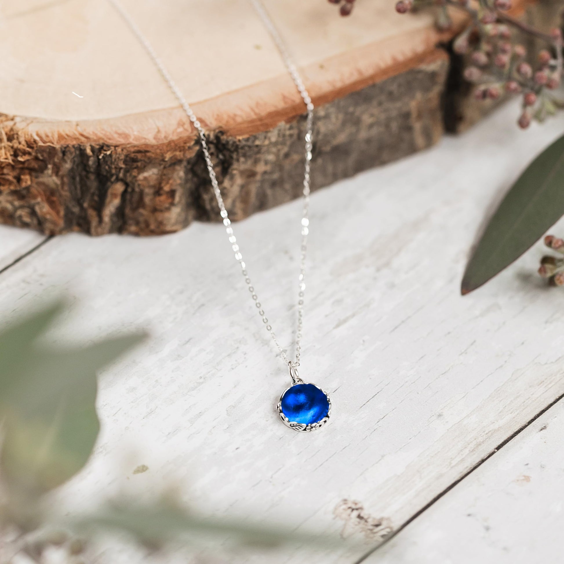 • This handmade necklace brings a touch of vintage charm to modern wardrobes, featuring cobalt glass from a recycled 1960s skin cream jar set in sterling silver. It's an ideal gift for those who appreciate history and style, offering a blend of elegance and environmental responsibility.