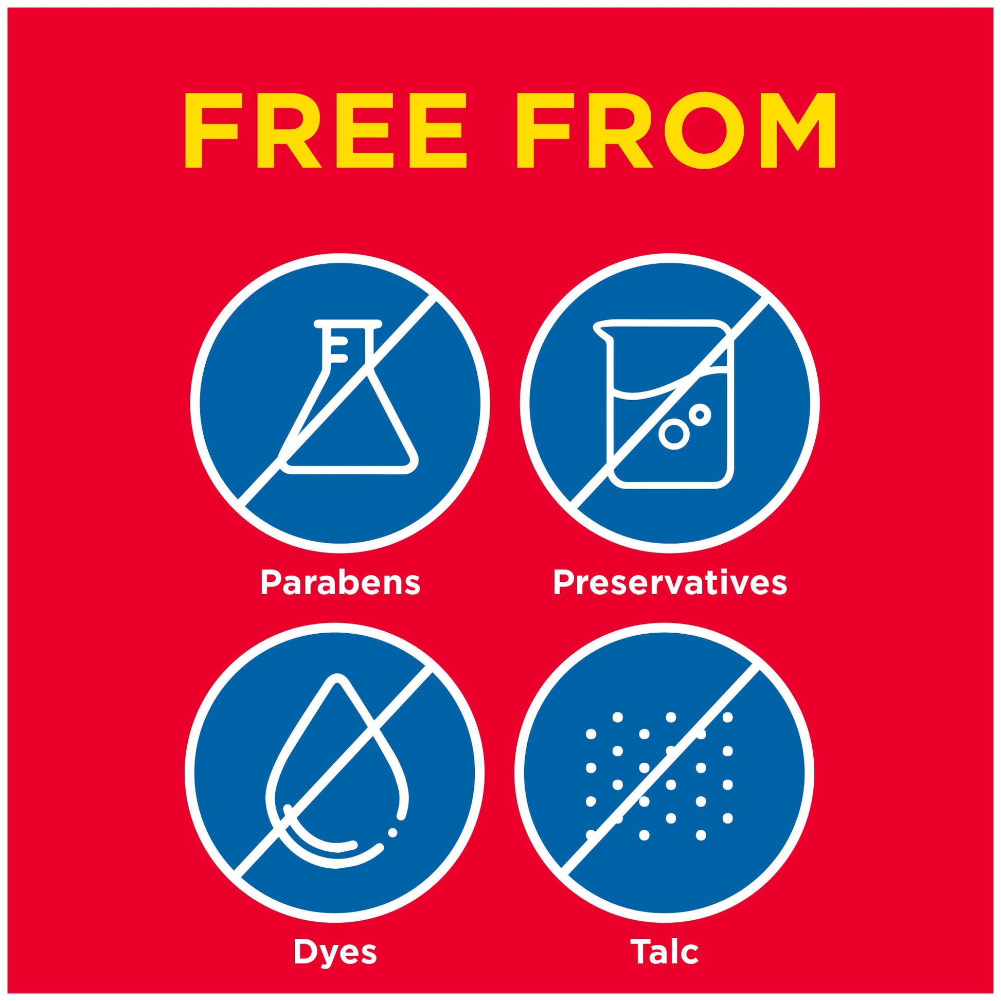 Free from dyes, preservatives, parabens and talc