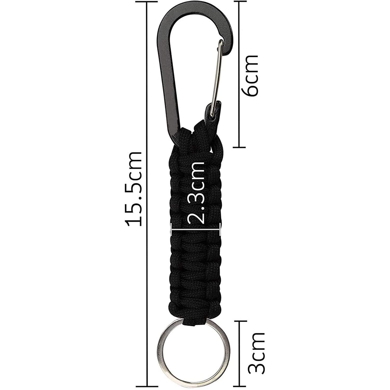 • Paracord keychain with metal carabiner clips is 6.1 Inch long and with 0.9 Inch wide braided paracord. It is a appropriate size to hook onto backpacks, bags, belt loops, or or put it into your pocket to secure your keys, small tools and gadgets.